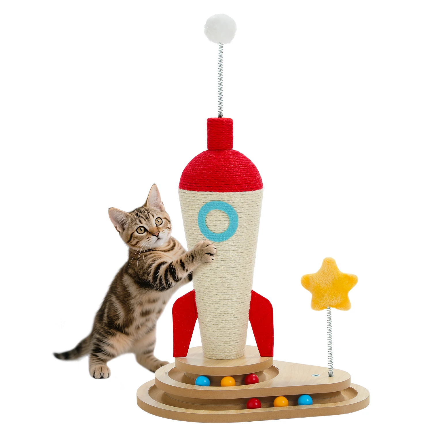 •Diversión multifuncional:El juguete combina una pista de pelota, un tallo para rascar de sisal y una pelota para colgar, para infinitas posibilidades de juego.Tu gato puede perseguir las bolas rodantes, saltar la bola colgante o quitar el tallo del rascador.Ideal para promover el movimiento y reducir el estrés.