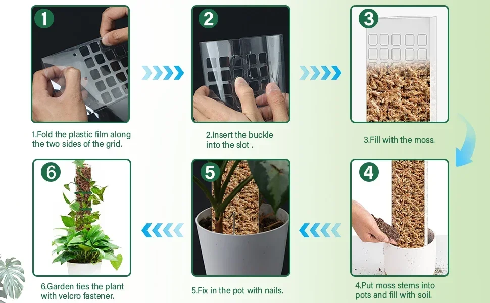 Postes de musgo Plantas Soporte para plantas Plástico Transparente Reutilizable Interior Palos en maceta Tren Enredadera Planta para crecer hacia arriba para el jardínAcerca de este artículoNuestro poste de musgo presenta un diseño semicilíndrico que lo distingue de los típicos postes cilíndricos de coco. Con una superficie plana única, proporciona una mejor fijación para las raíces aéreas de su planta, asegurando condiciones óptimas de soporte y crecimiento.Nuestro poste de musgo está hecho de material de PVC transparente, con una altura de aproximadamente 24 pulgadas/12 pulgadas, adecuado para la mayoría de las plantas trepadoras, Y permite una fácil observación del crecimiento de las raíces de la planta y las condiciones del suelo.El poste de musgo Sphagnum ayuda en gran medida a trepar plantas en macetas de interior con raíces aéreas a superar la dificultad de crecer verticalmente hacia la luz solar y desarrollar más hojas, más grandes y más verdes.El poste de la planta tiene 2 líneas de pliegue que debe plegar para hacer un poste de musgo semicilíndrico. ¡No lo enrolle directamente en un cilindro! Si tiene algún problema de montaje, póngase en contacto con nosotros.Este juego es suficiente para satisfacer sus necesidades diarias de plantación. Recomendamos usar musgo Sphagnum (no incluido) para obtener los mejores resultados, ya que proporciona agua y micronutrientes de larga duración para las plantas trepadoras.