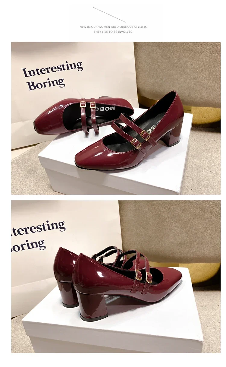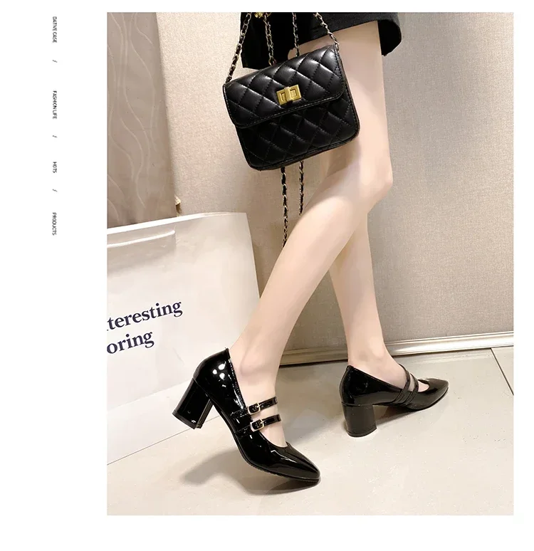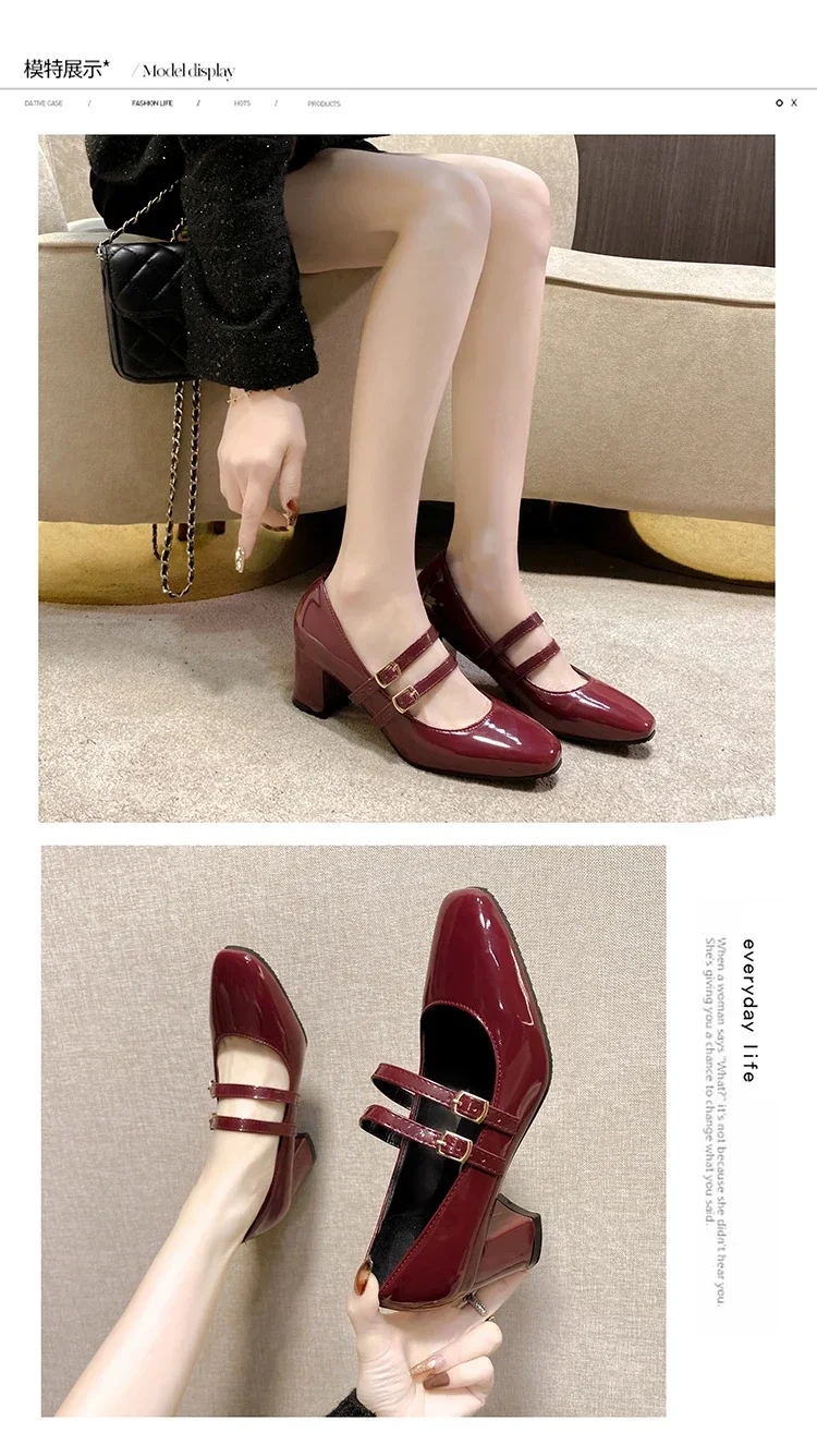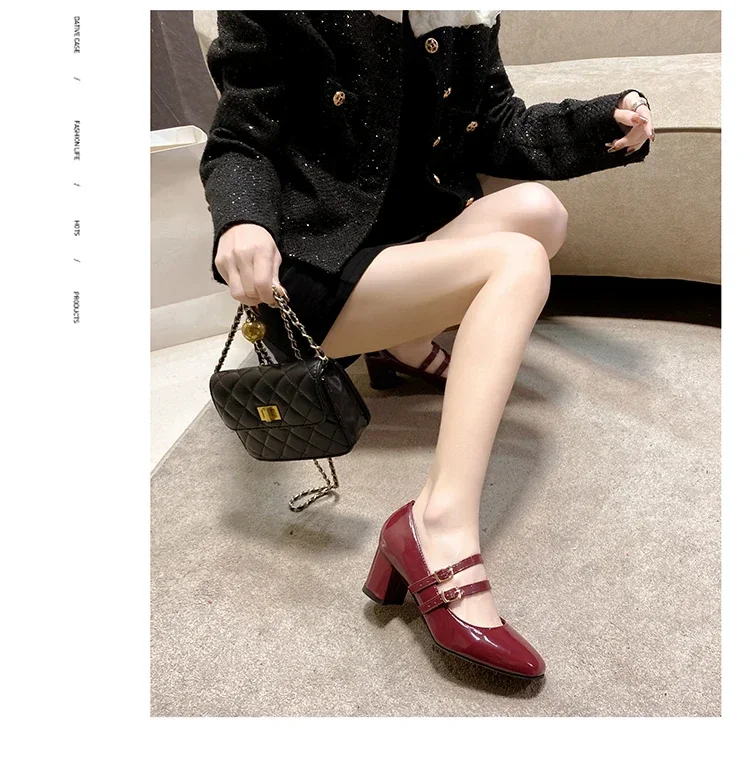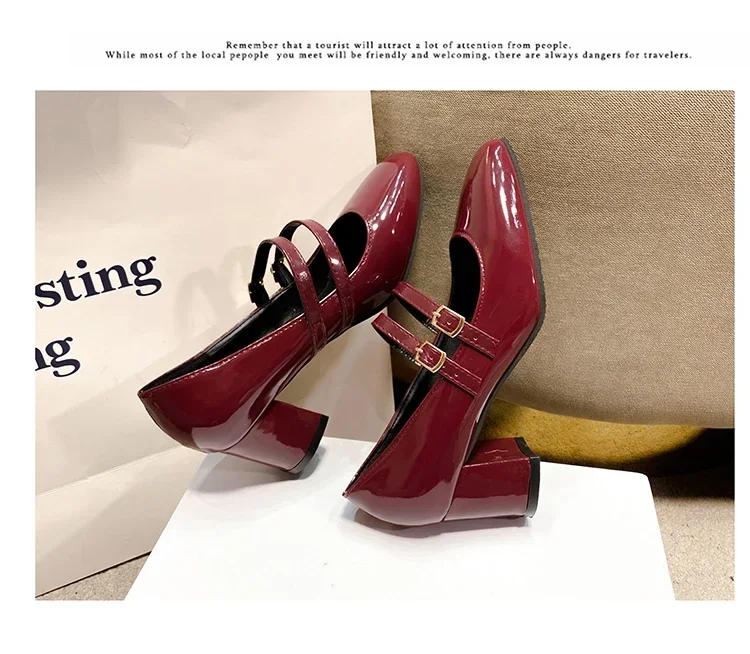 Primavera otoño mujer doble hebilla zapatos Mary Jane charol zapatos de vestir tacones altos bombas Retro señoras zapato negro rojo