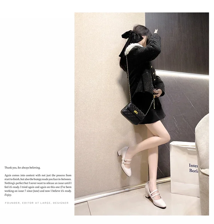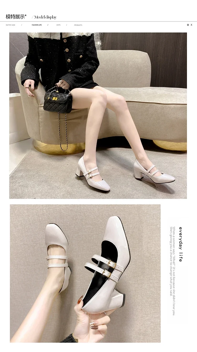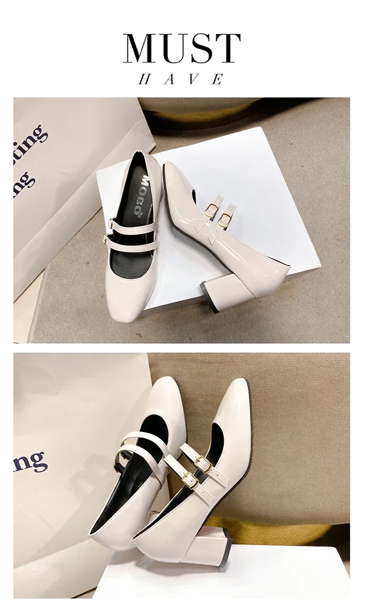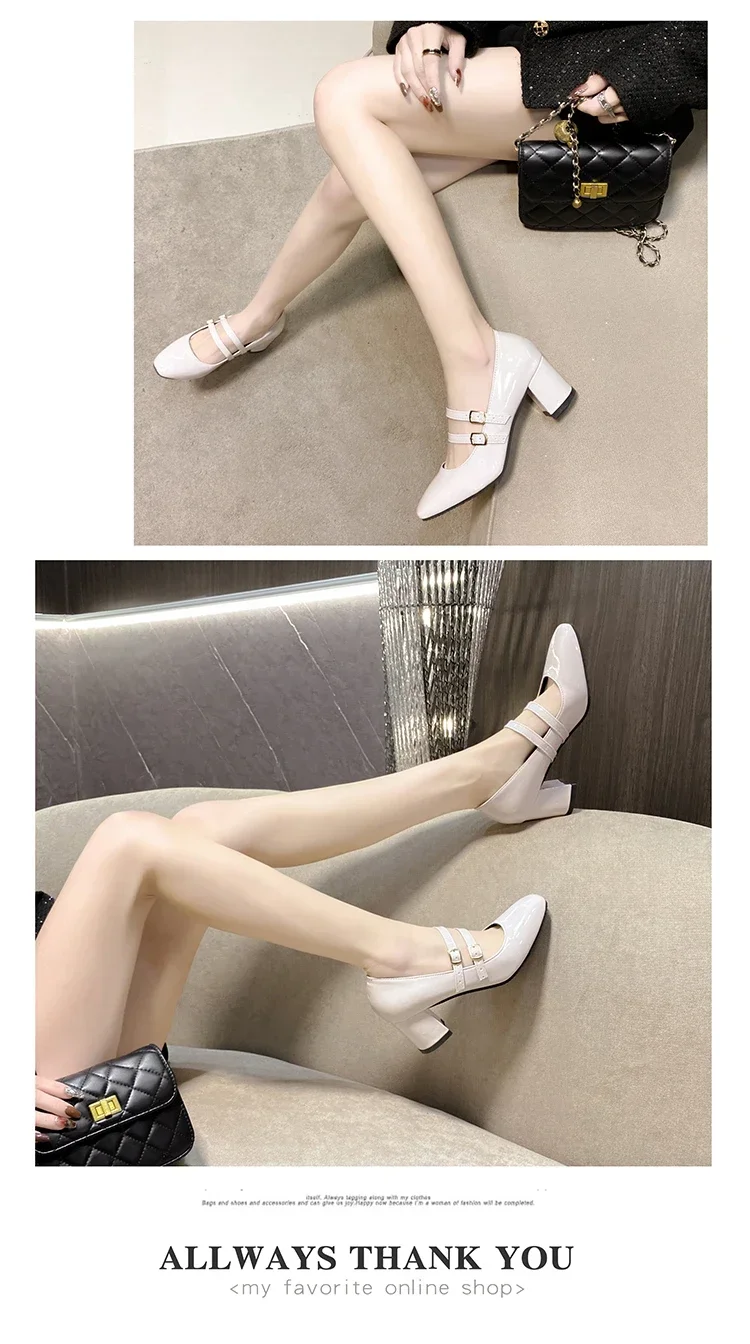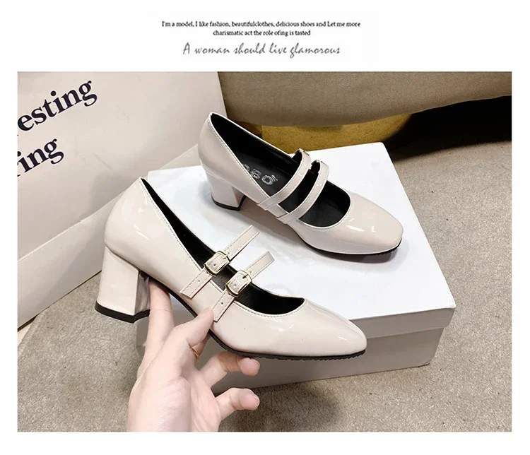Primavera otoño mujer doble hebilla zapatos Mary Jane charol zapatos de vestir tacones altos bombas Retro señoras zapato negro rojo
