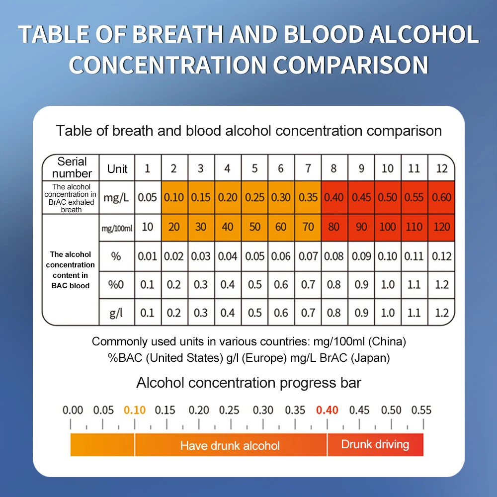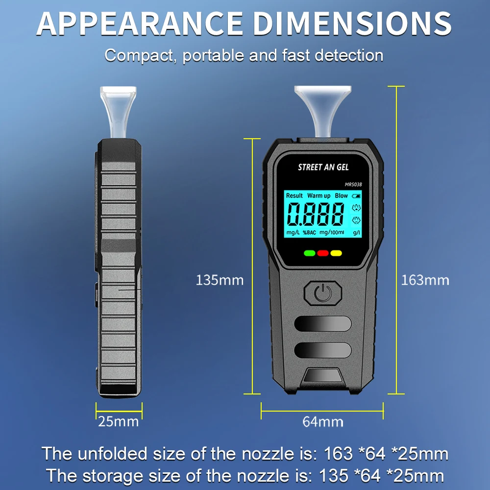 El alcoholímetro es un alcoholímetro compacto y altamente sensible diseñado para una detección precisa y rápida del contenido de alcohol en sangre (BAC).Equipado con un sensor de gas semiconductor y configuraciones de unidades multilingües (%BAC, mg/L, mg/100 ml, g/L), este probador es ideal para controles de seguridad personales, pruebas en la carretera y monitoreo del conductor de flota.