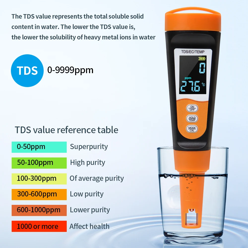 Rango de medición: 0-9999 ppm; 0-9999us/Cm; 0-60℃/32-140℉
