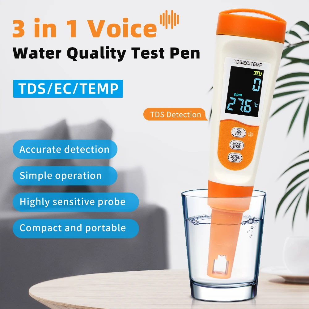 Probador de calidad del agua 3 en 1, pluma de prueba EC TDS TEMP, carga tipo C, transmisión de voz, instrumento de prueba de agua multiparámetro