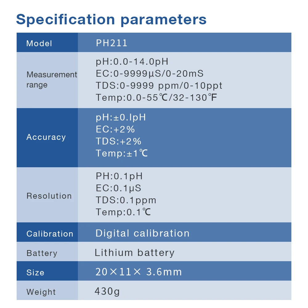 · TDS: 0-9990 ppm/0-10,00 ppt