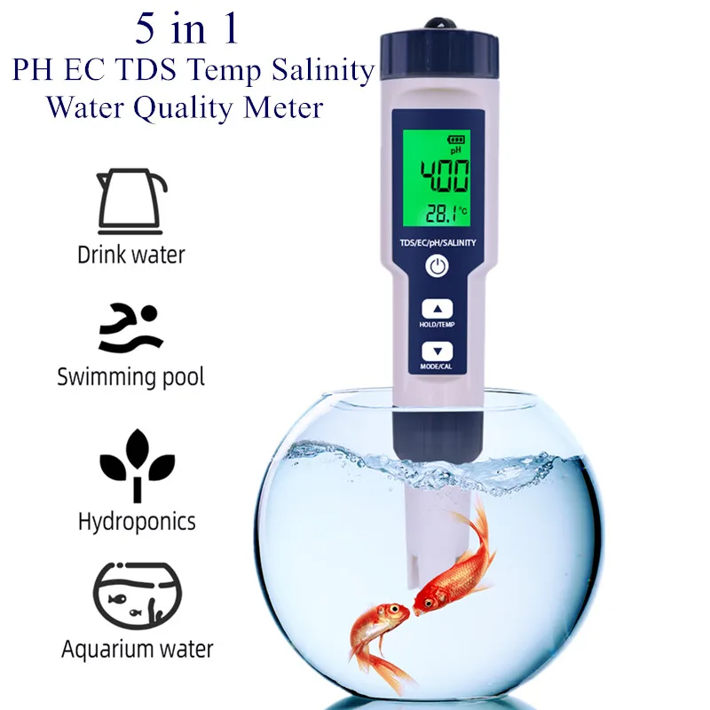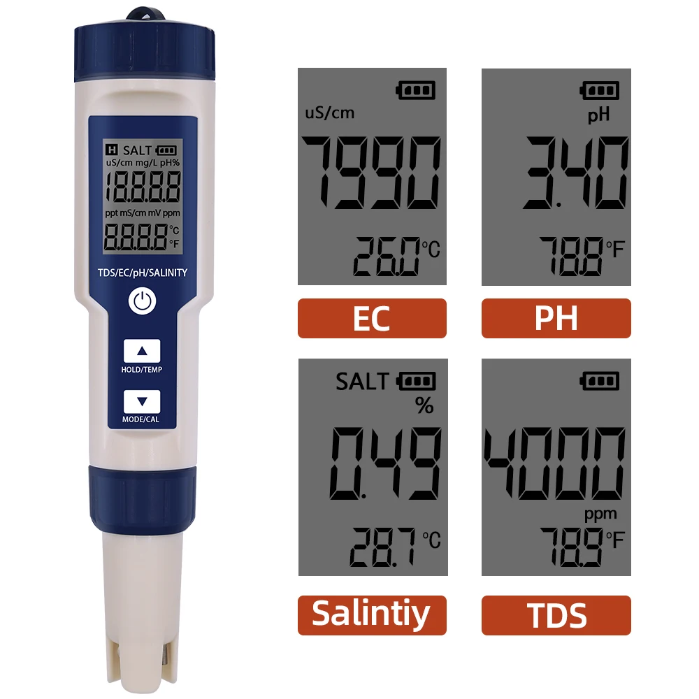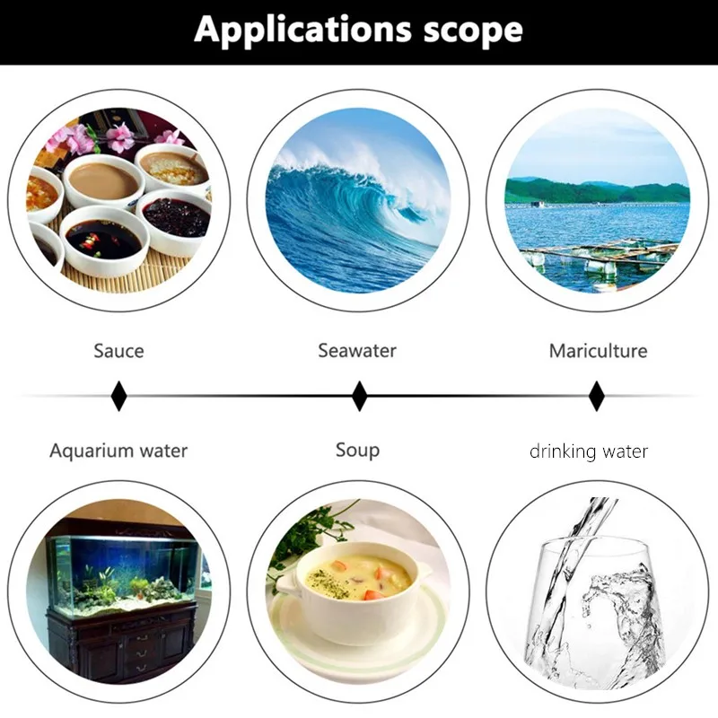 Uso amplio:El medidor de temperatura de salinidad EC TDS de pH de bolsillo es el probador para usos domésticos y de laboratorio. Se usa para analizar el agua, piscinas, acuarios, spas, hidroponía, alimentos y más.