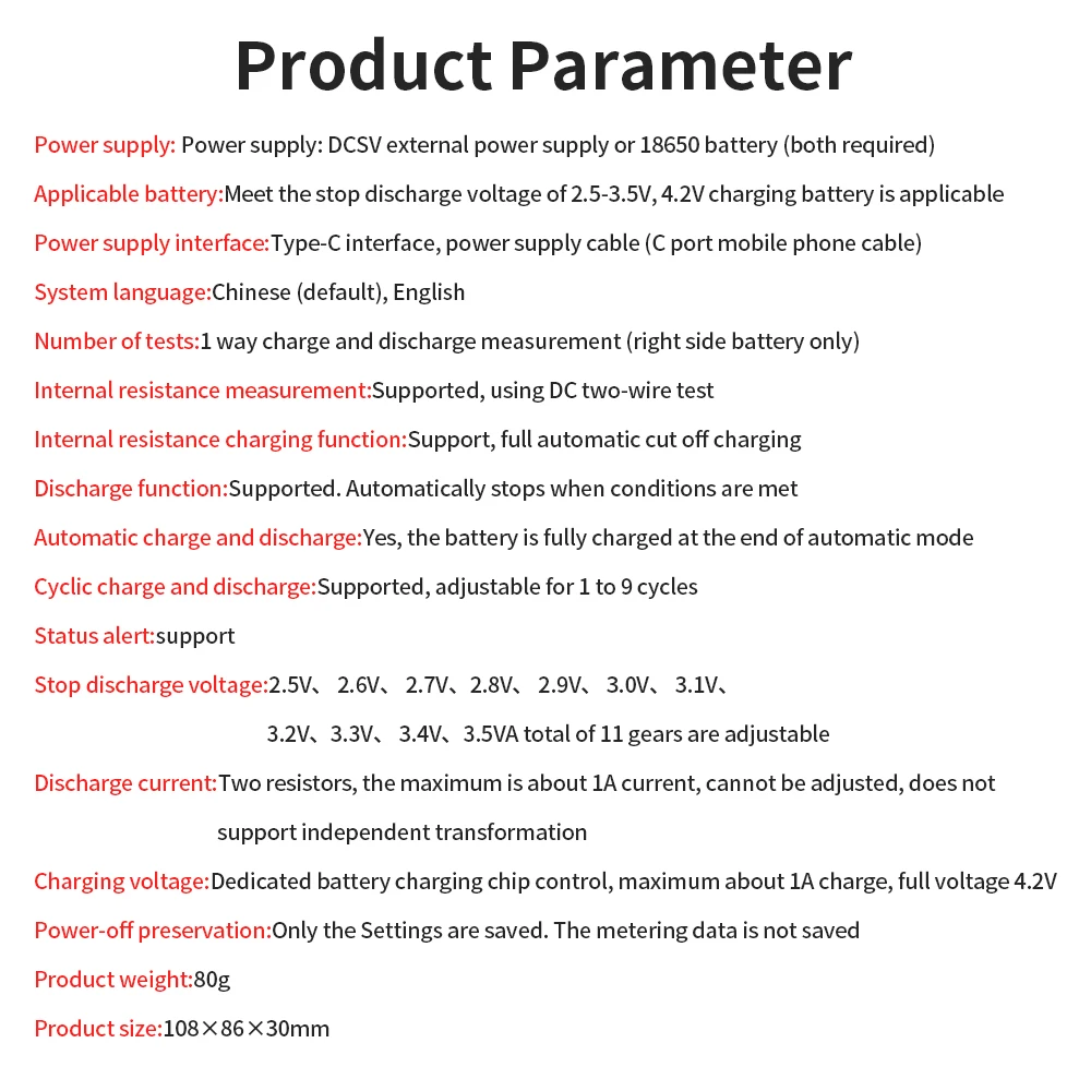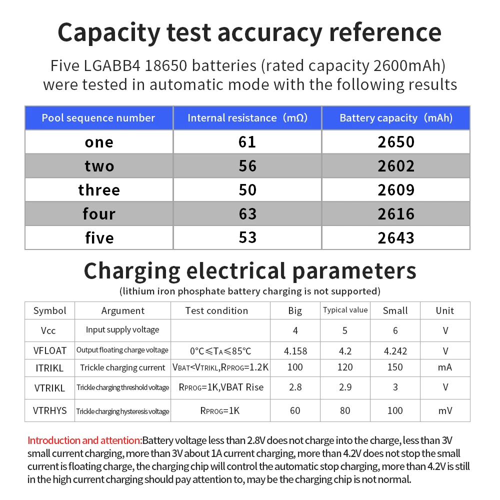 Batería aplicable: adecuada para todas las baterías que cumplen con los requisitos de voltaje de descarga de parada de 2,5 ~ 3,5 V y a partir de 2,8 V a 4,2 V