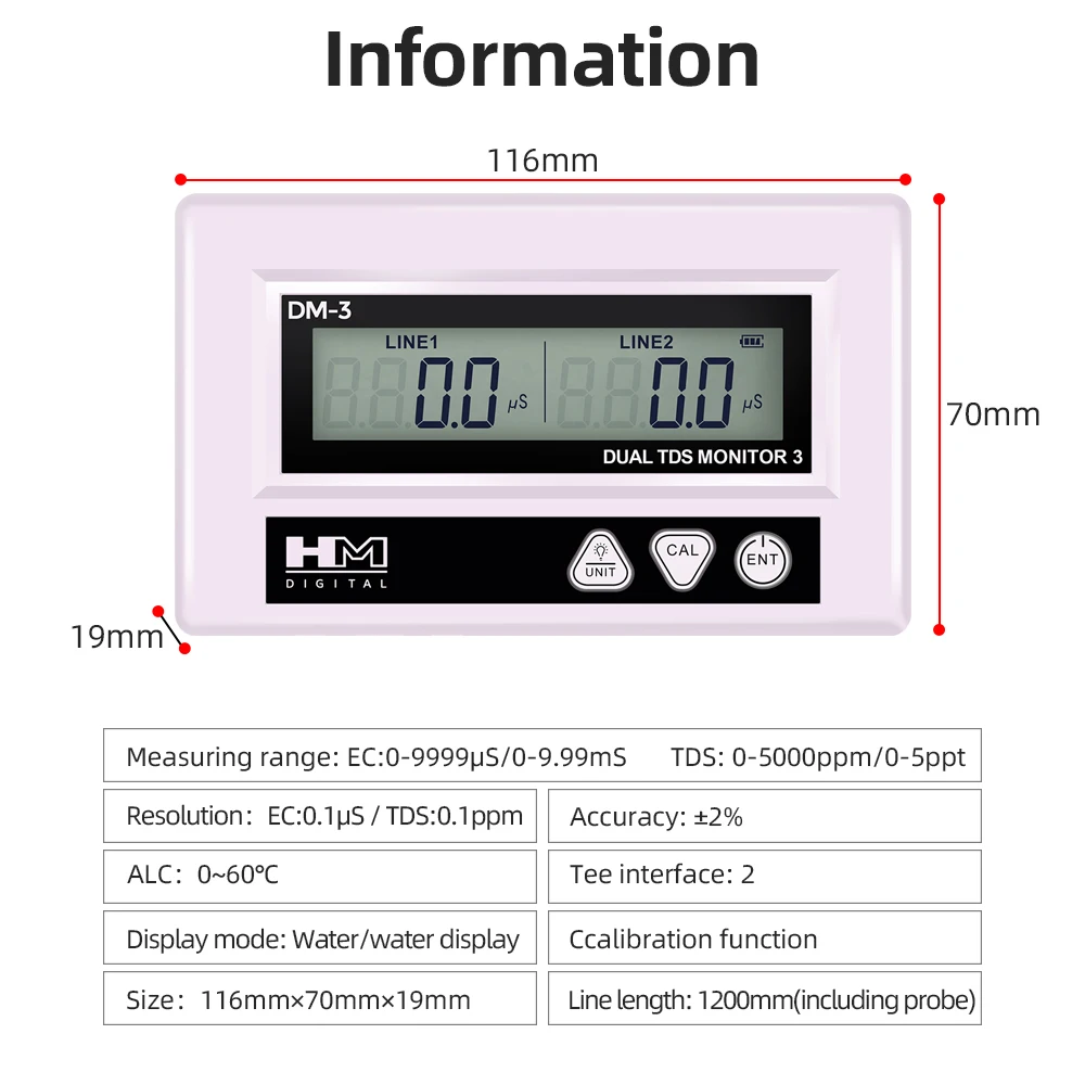 *Calibrado de fábrica: nuestros medidores están calibrados con una solución NaCl de 342 ppm.El DM-3 cuenta con calibración digital.