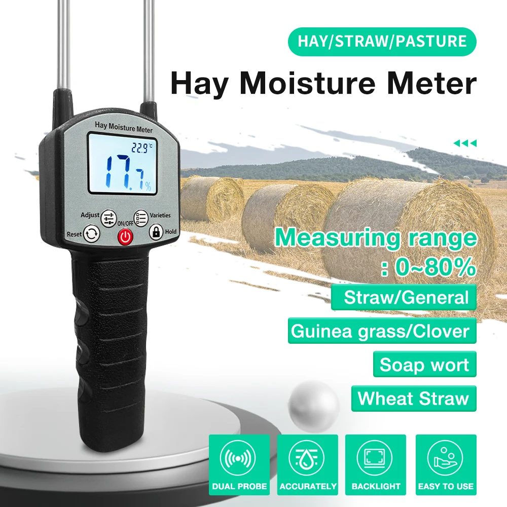 Probador de humedad de forraje con pantalla LCD Medidor de humedad de heno de mano Probador de humedad de pasto de paja de heno 0-80% Detector de contenido de agua