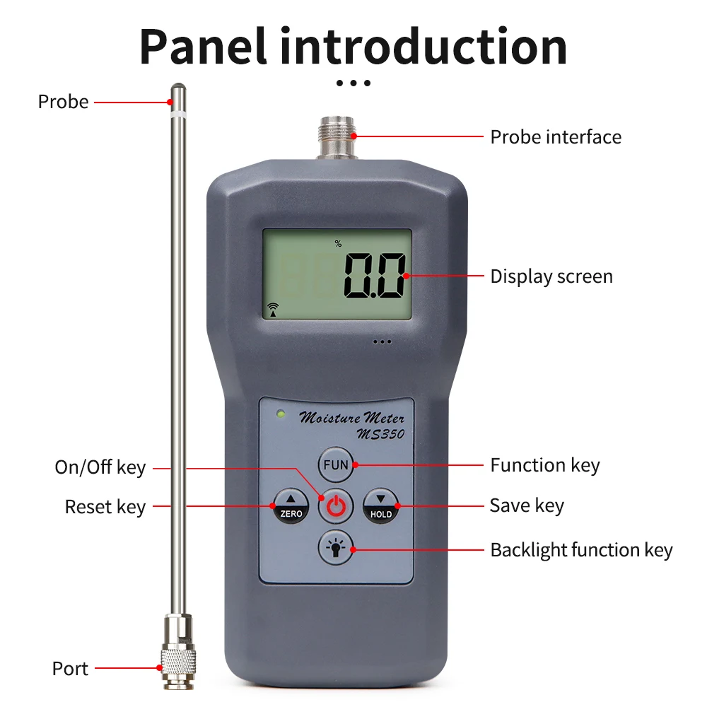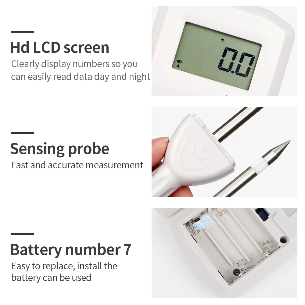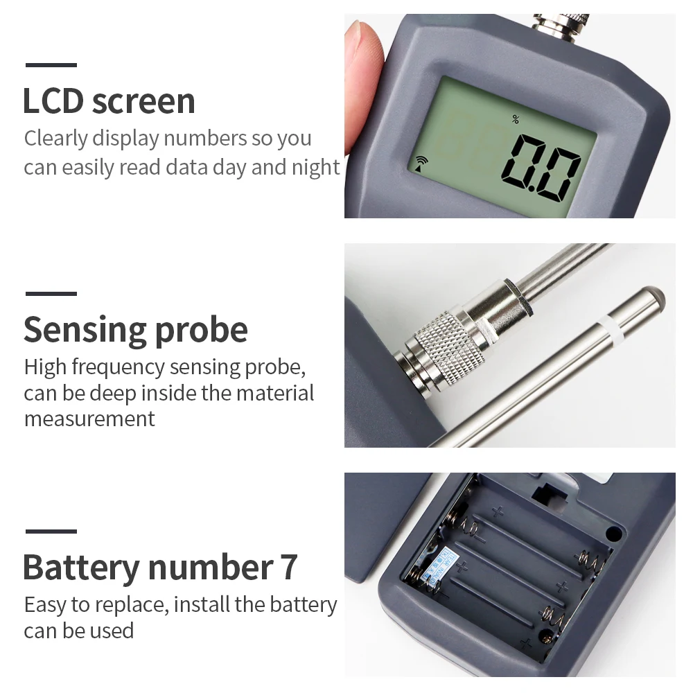 4.El medidor de humedad funciona mediante resistencia eléctrica y tiene compensación automática de temperatura.