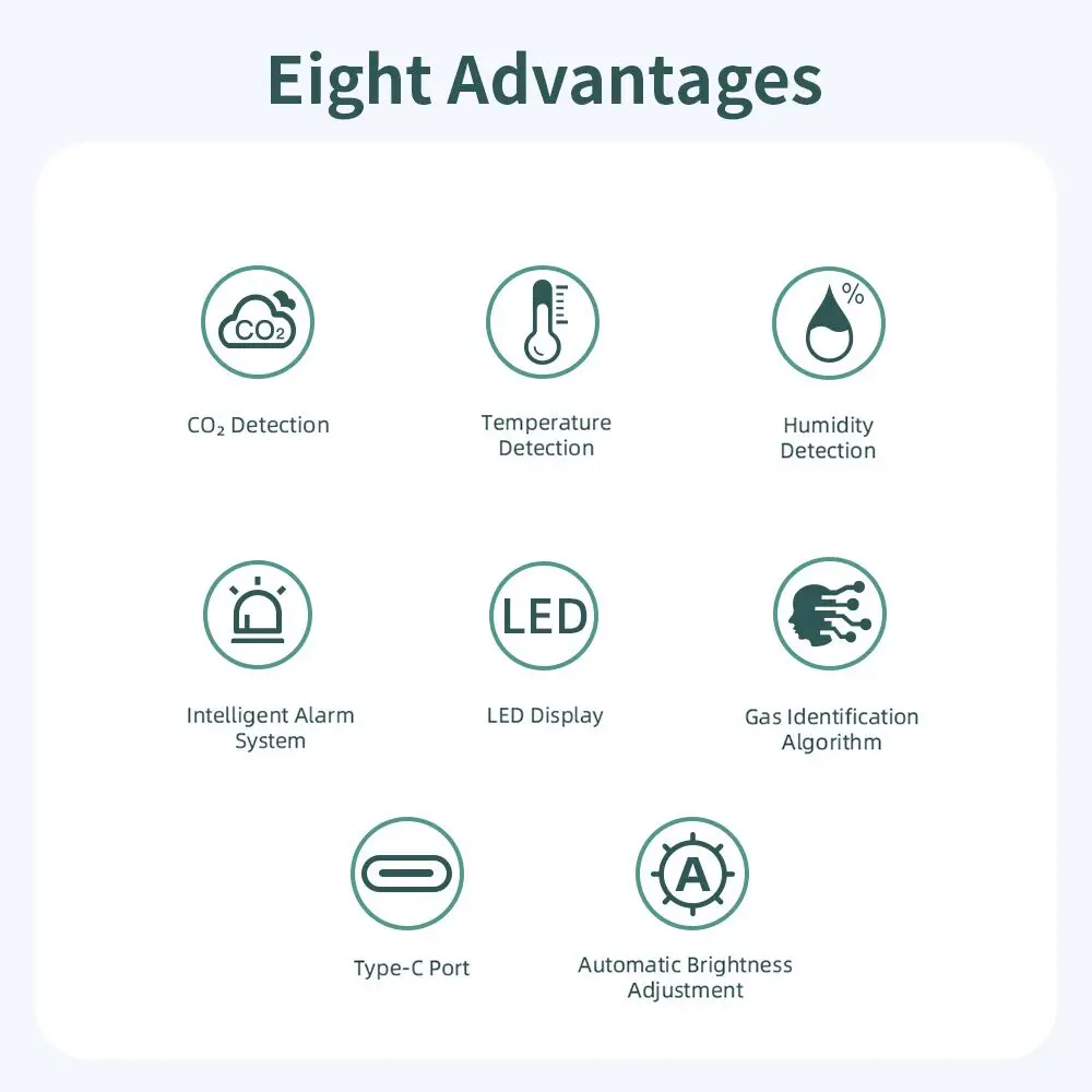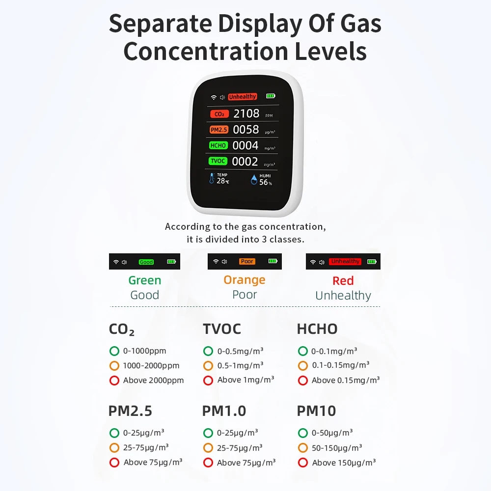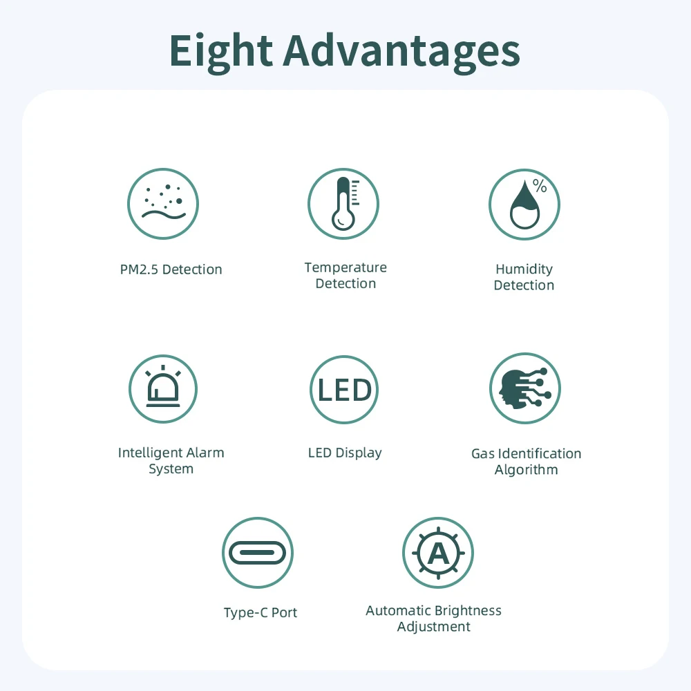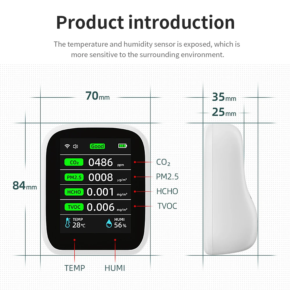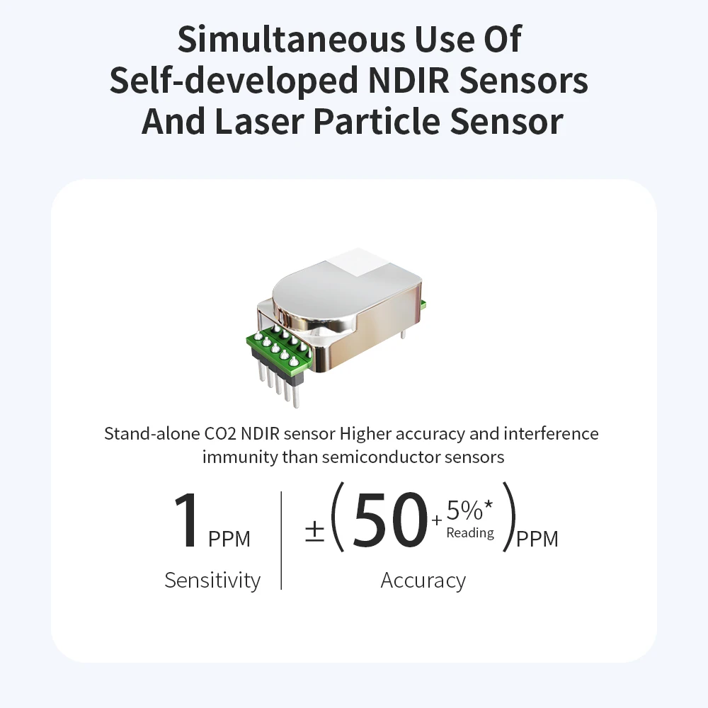 【Sensores de alta precisión】: utiliza un sensor de dióxido de carbono infrarrojo NDIR de alta precisión, un sensor de partículas láser, un sensor semiconductor, un sensor óptico y un sensor de distancia, con alta sensibilidad, capacidad superior de resistencia a interferencias, rendimiento de trabajo estable y bajo consumo de energía.