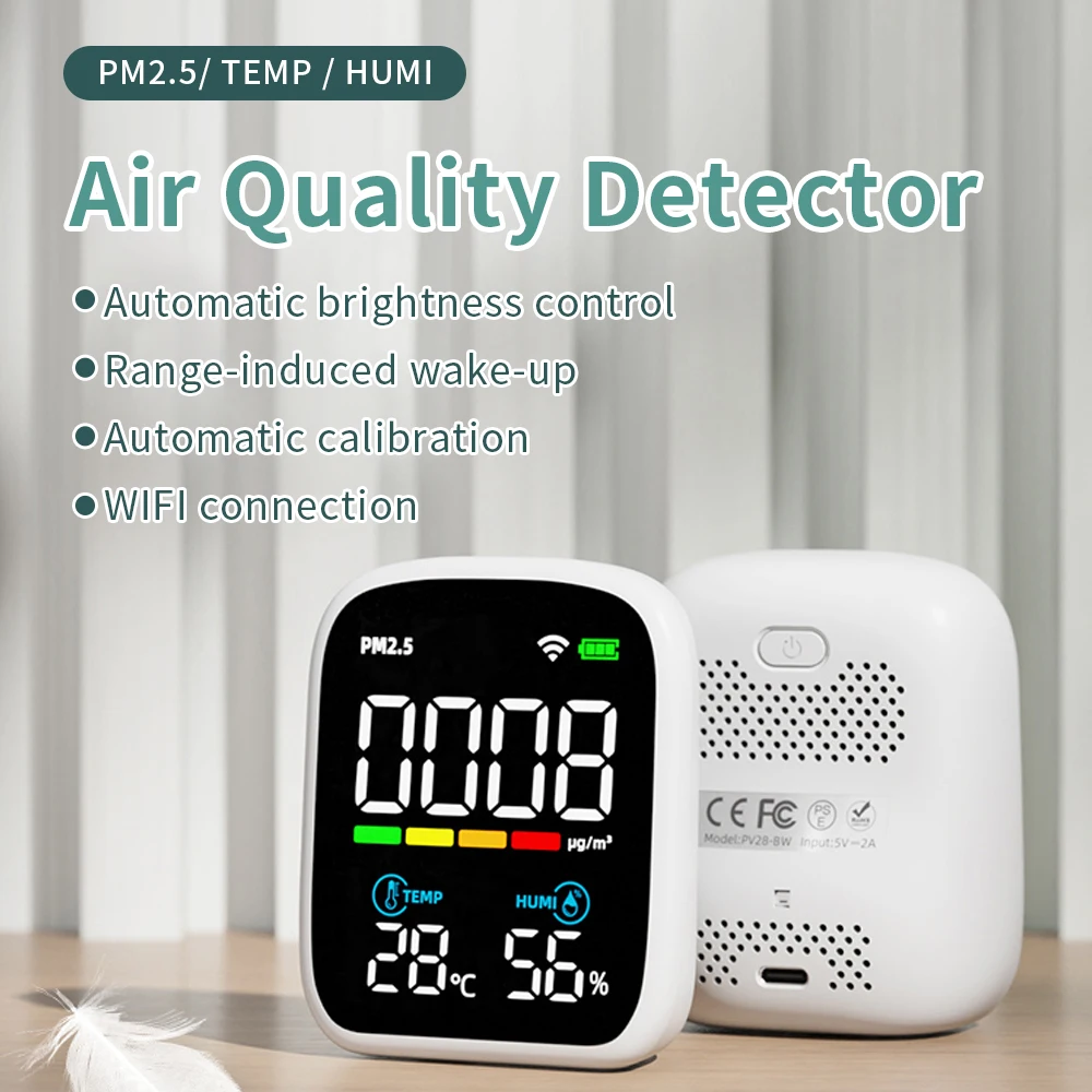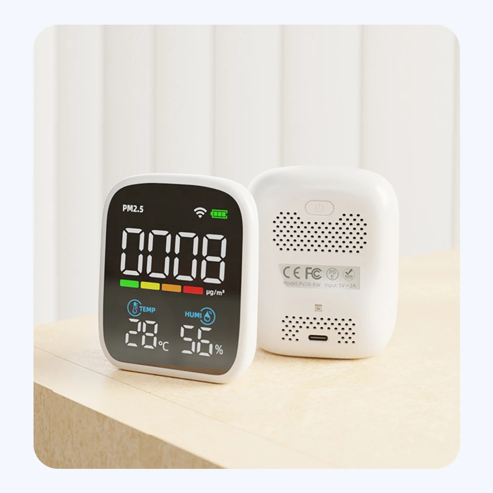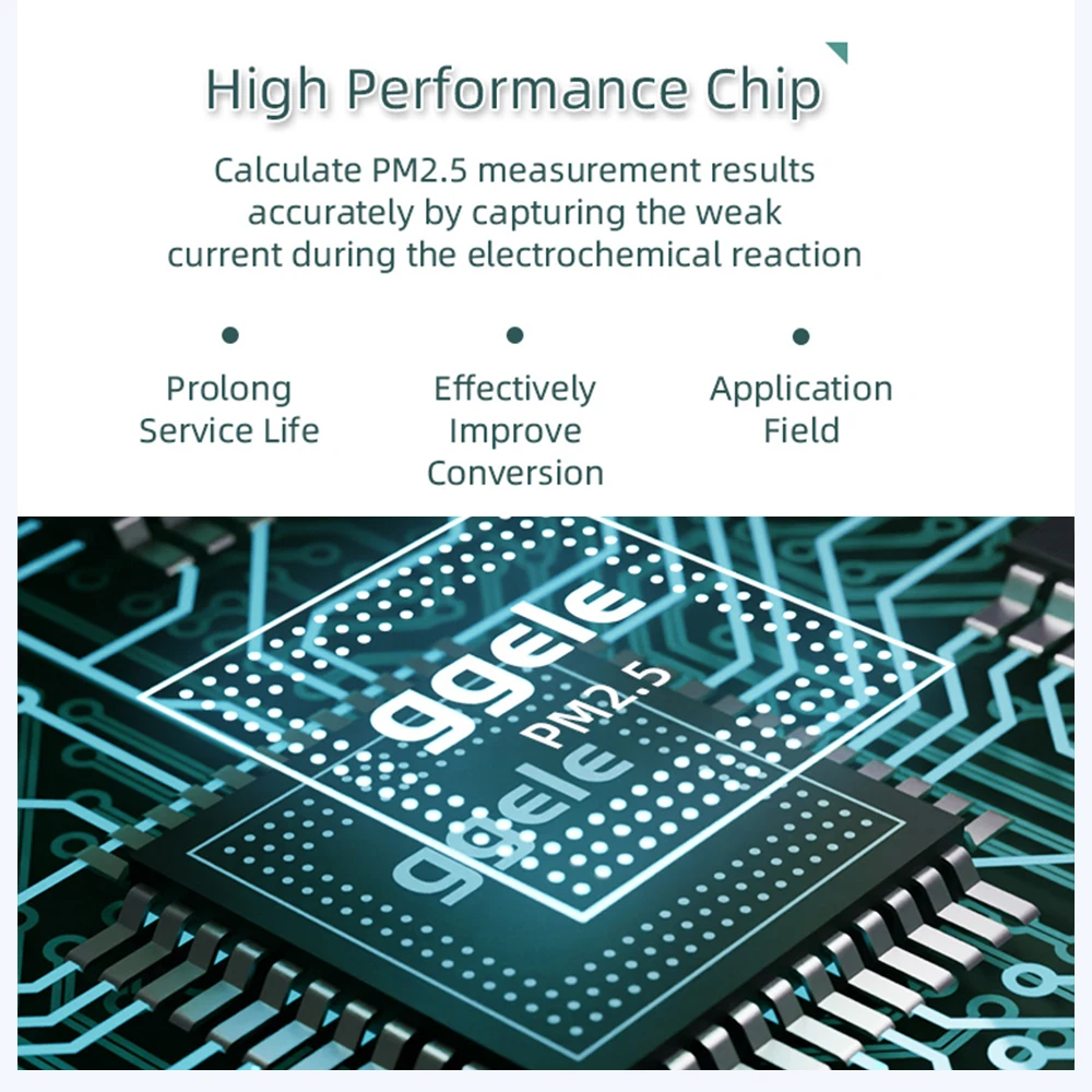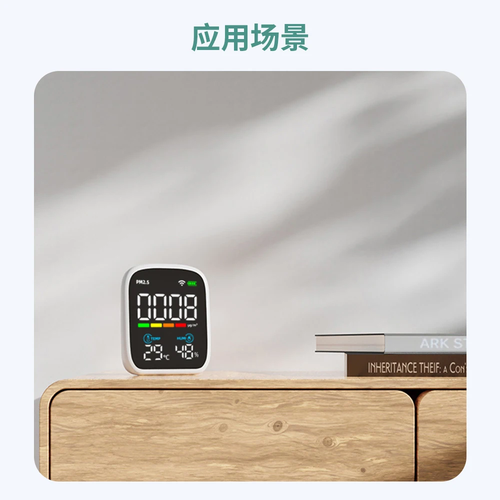 Este probador de calidad del aire portátil adopta un sensor de partículas láser y un sensor óptico de alta precisión, con un rendimiento estable y alta precisión de detección, lo que admite el monitoreo en tiempo real de la concentración de PM2,5, la temperatura y la humedad relativa en el aire.