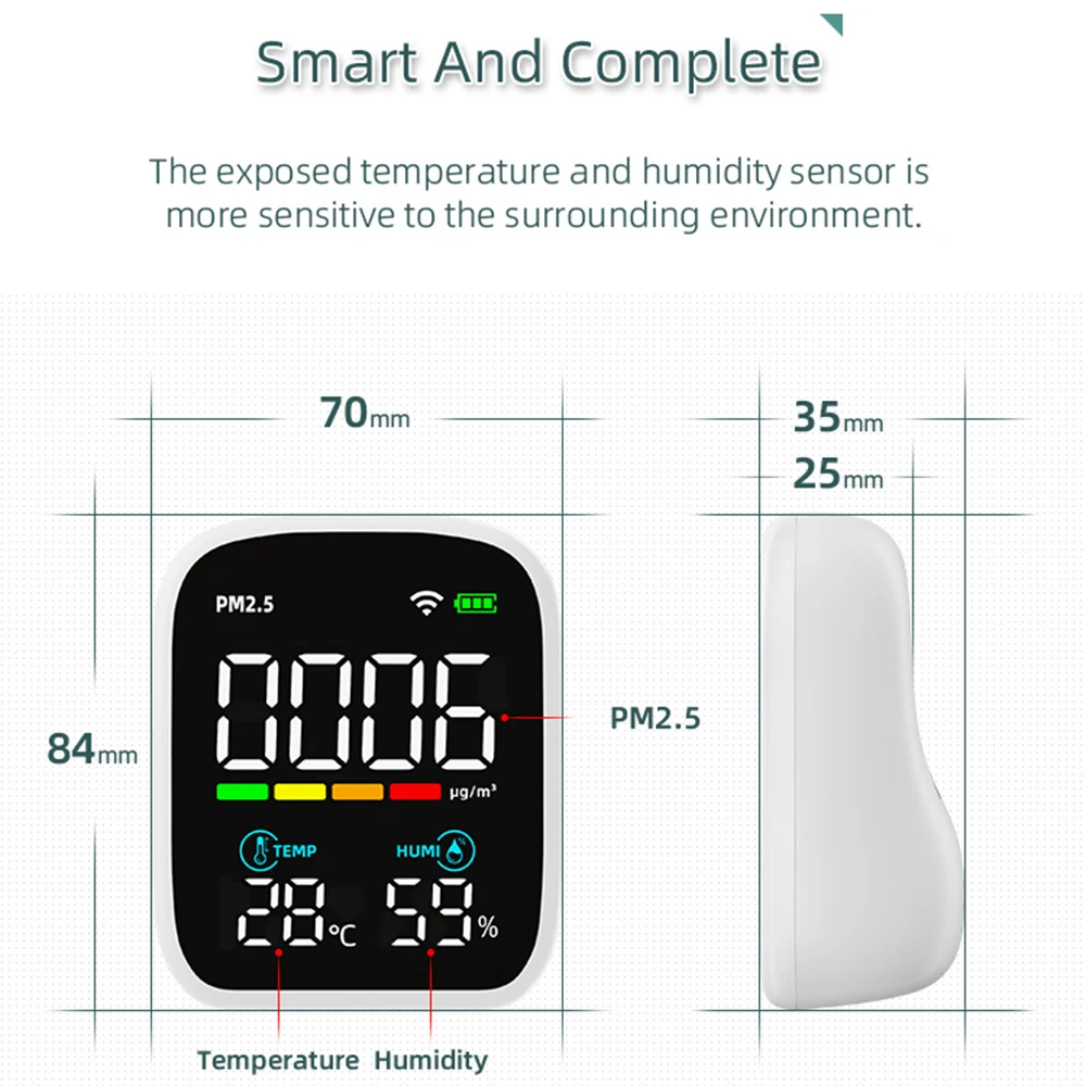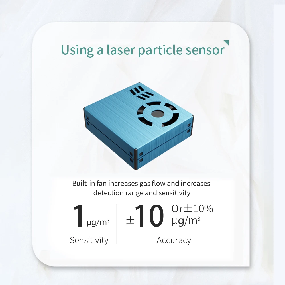 【Compacto y exquisito】: diseño de cuerpo compacto, apariencia simple y elegante, liviano y fácil de transportar.Carcasa porosa 3D con múltiples orificios de ventilación diseñada para la convección de circulación de aire en tiempo real.El sensor y el aire están completamente en contacto, son muy sensibles y precisos en la detección de pequeños contenidos de partículas.