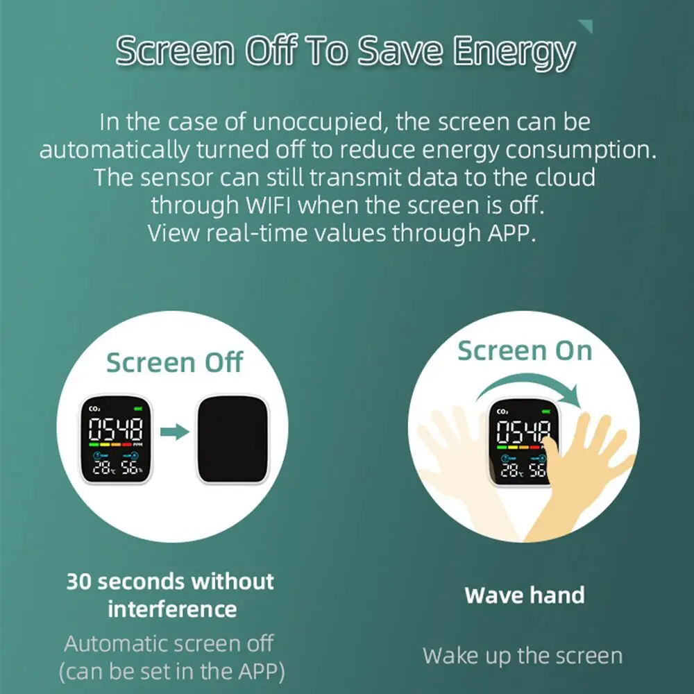 【Pantalla de ahorro de energía apagada y despertador de mano】: Cuando nadie usa la pantalla, puede apagar automáticamente la pantalla para reducir el consumo de energía, y el sensor aún puede transmitir datos a la nube a través de WIFI en el estado apagado de pantalla. para que puedas ver los valores en tiempo real a través de la APP.Admite despertar la pantalla agitando la mano a la distancia de detección.