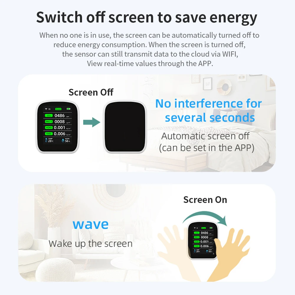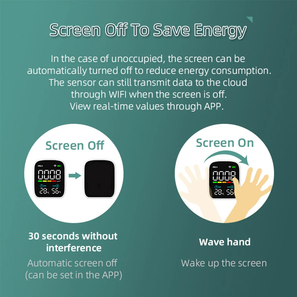 【Activación del sueño y el enfoque】: la pantalla se puede apagar automáticamente para reducir el consumo de energía después de no realizar ninguna operación, y el sensor aún puede transmitir datos a la nube a través de WIFI cuando la pantalla está apagada, y puede ver el tiempo real valores a través de la APP.Este producto contiene un sensor de distancia, en estado inactivo (dormancia después de 30 segundos sin detección, puede cerrar esta función en la APLICACIÓN) puede acercarse al producto directamente o darle un mensaje frente al producto para activar la pantalla.