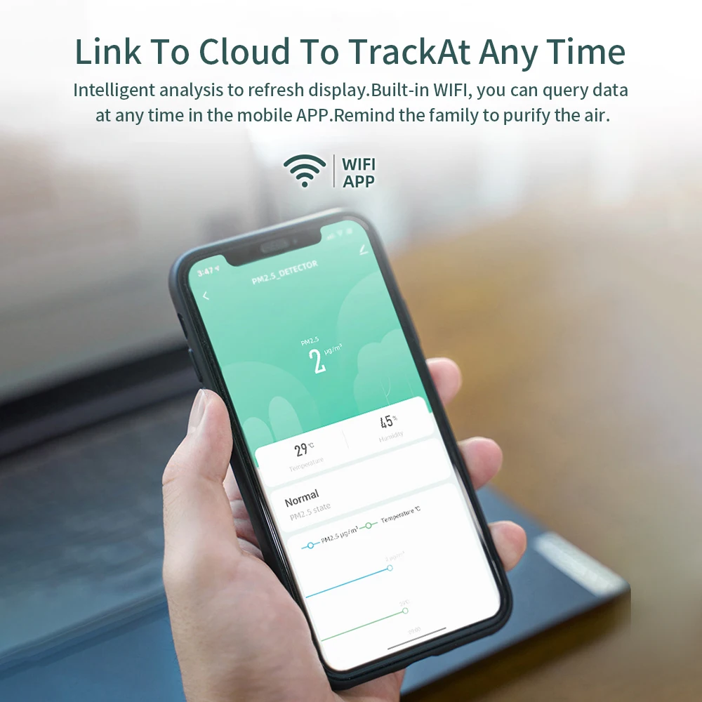【Conexión WiFi y control de aplicaciones de teléfonos móviles】: WIFI incorporado para enlace en la nube, actualización en tiempo real de datos de calidad del aire a través de la aplicación de teléfonos móviles, los usuarios pueden verificar los datos de calidad del aire en cualquier momento y en cualquier lugar, lo que permite a los usuarios realizar un seguimiento del aire en su hogar y recordarle a su familia que purifique el aire.