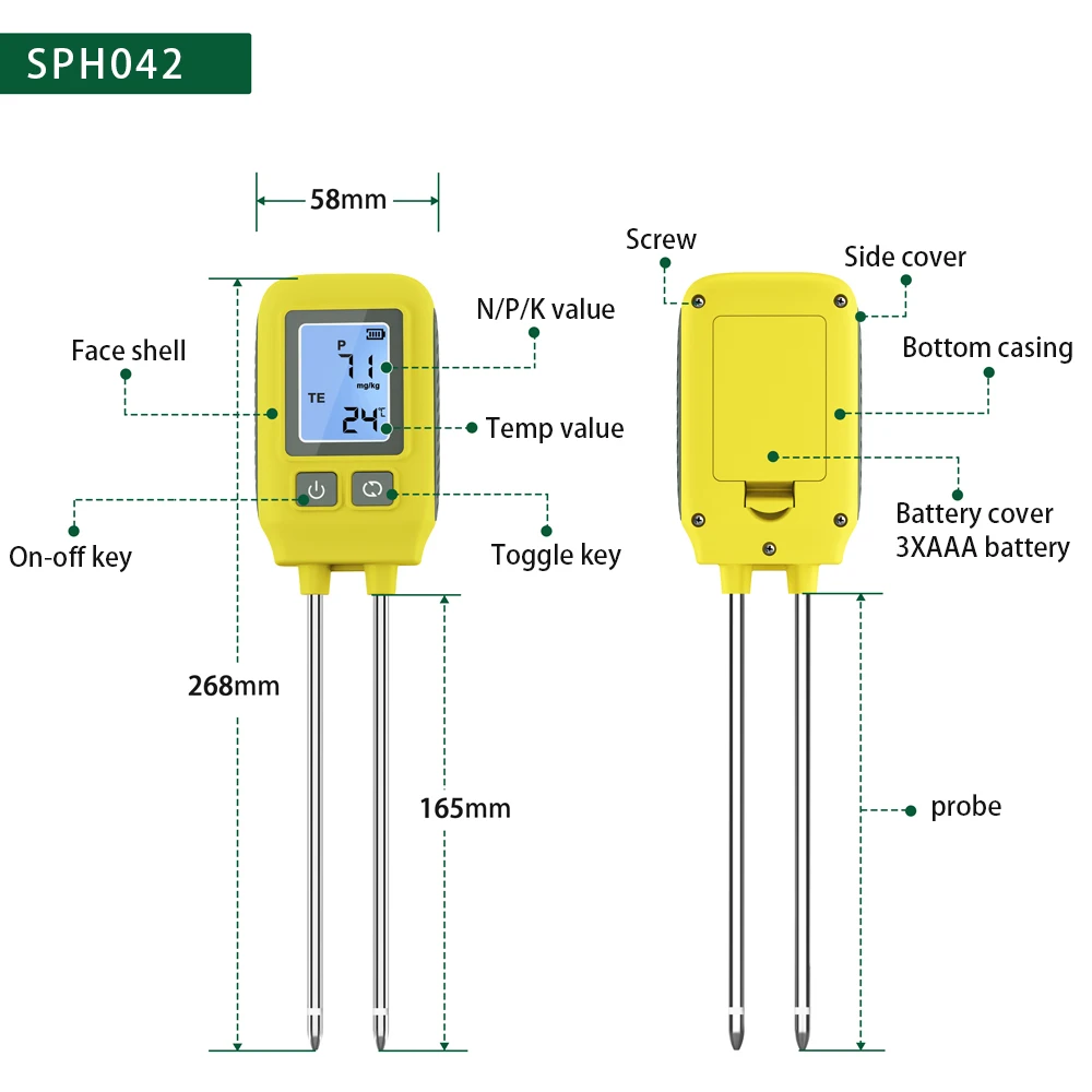 【Sonda de acero inoxidable】: Equipado con una sonda de acero inoxidable resistente a la corrosión, que garantiza confiabilidad y durabilidad a largo plazo, incluso cuando se usa con frecuencia en diferentes tipos y entornos de suelos.