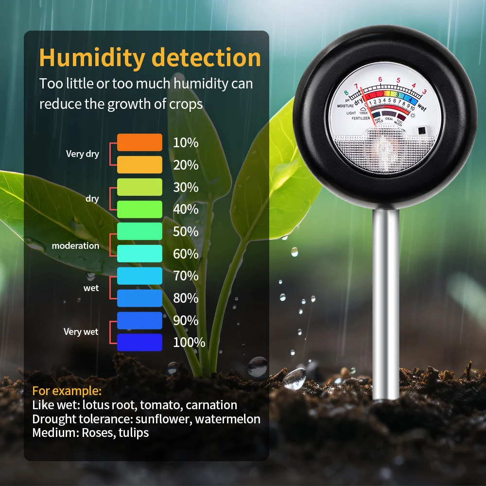 Función de prueba de humedad: la humedad del suelo determina el entorno de vida de las plantas, por lo que es más fácil para usted construir un invernadero estándar con este producto.