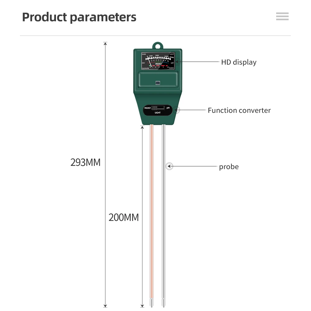 Contenido de humedad del suelo 3 en 1, medición de PH e iluminancia