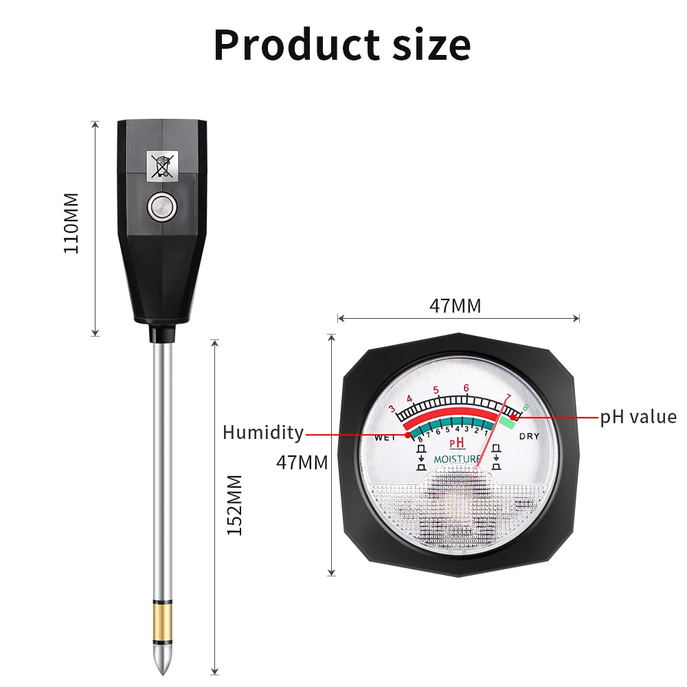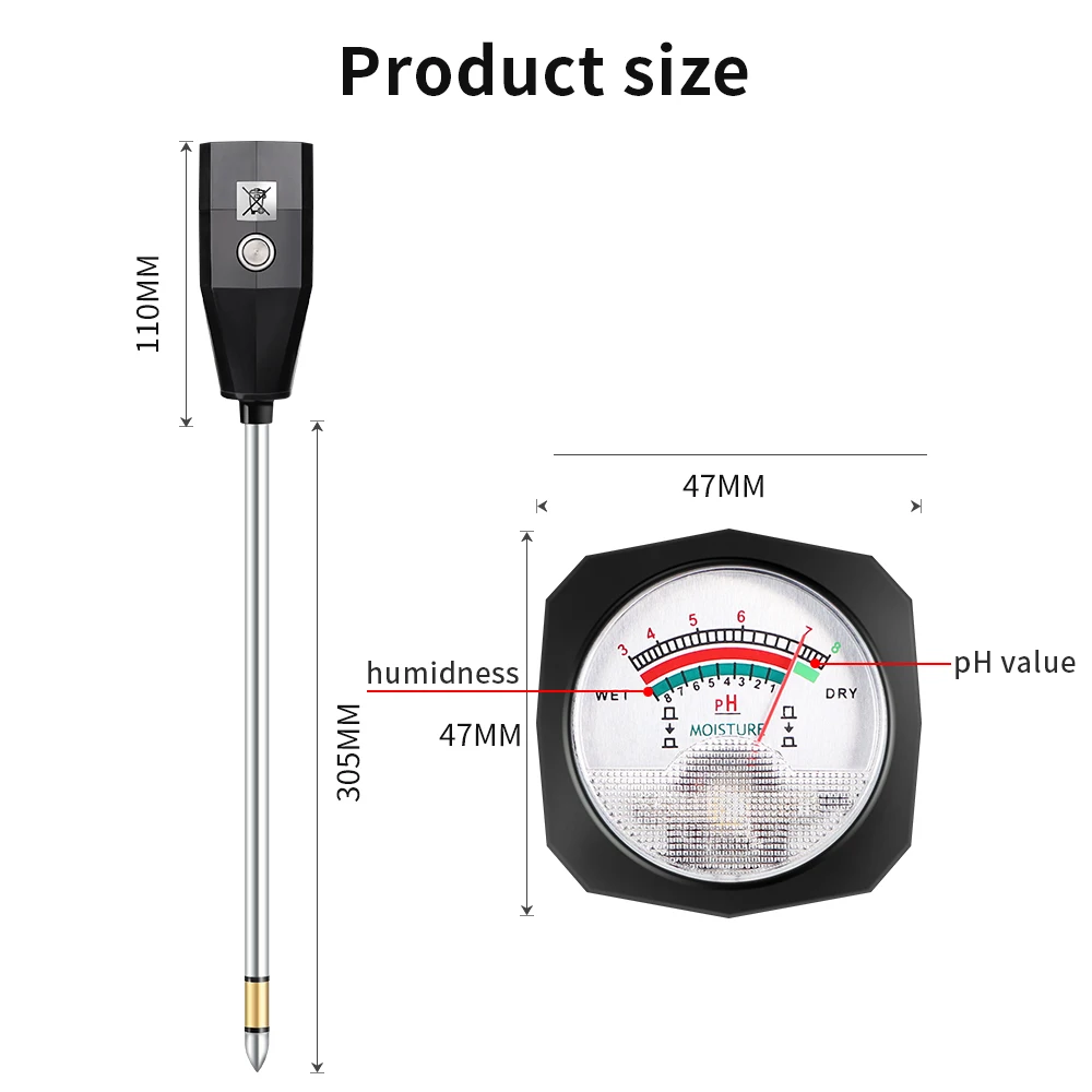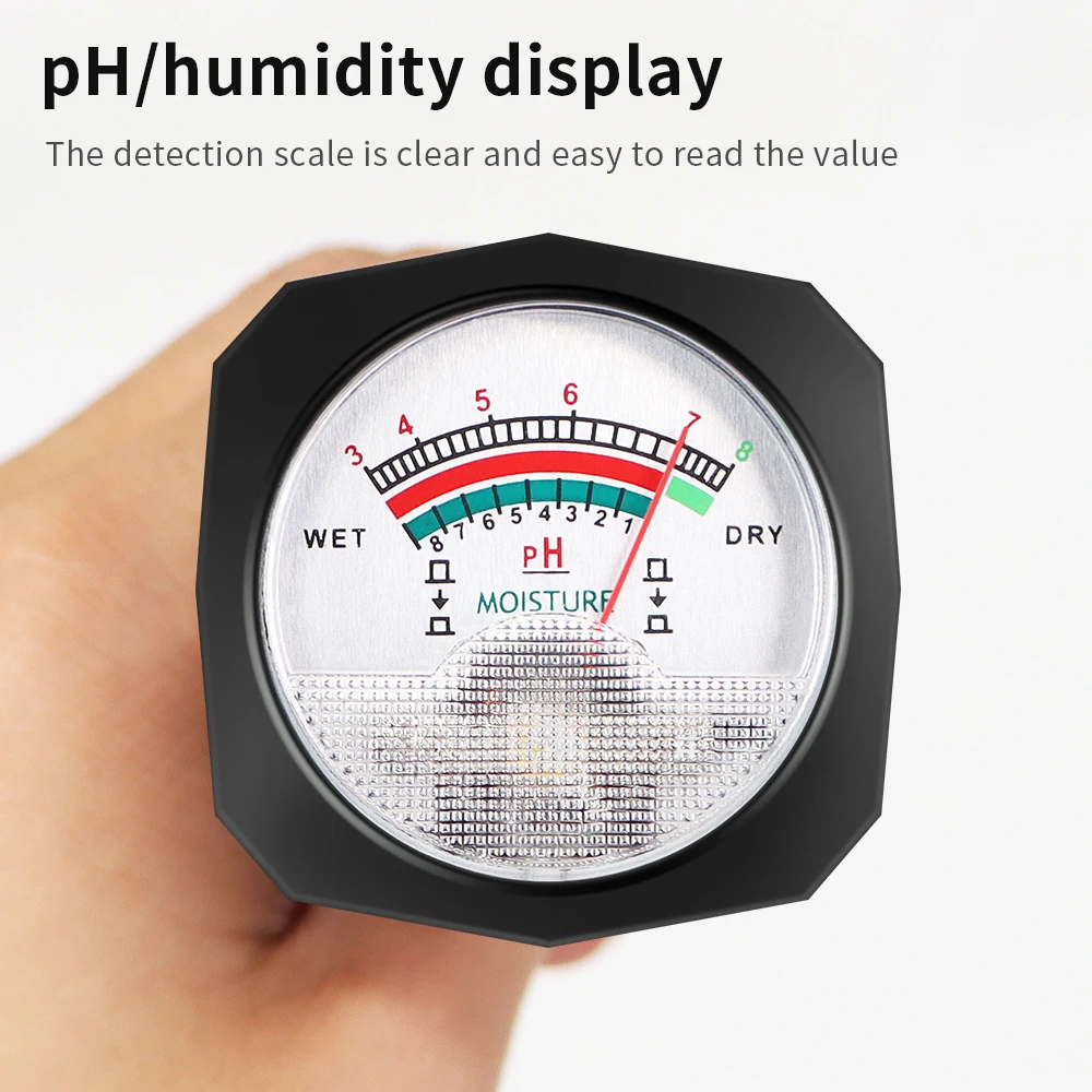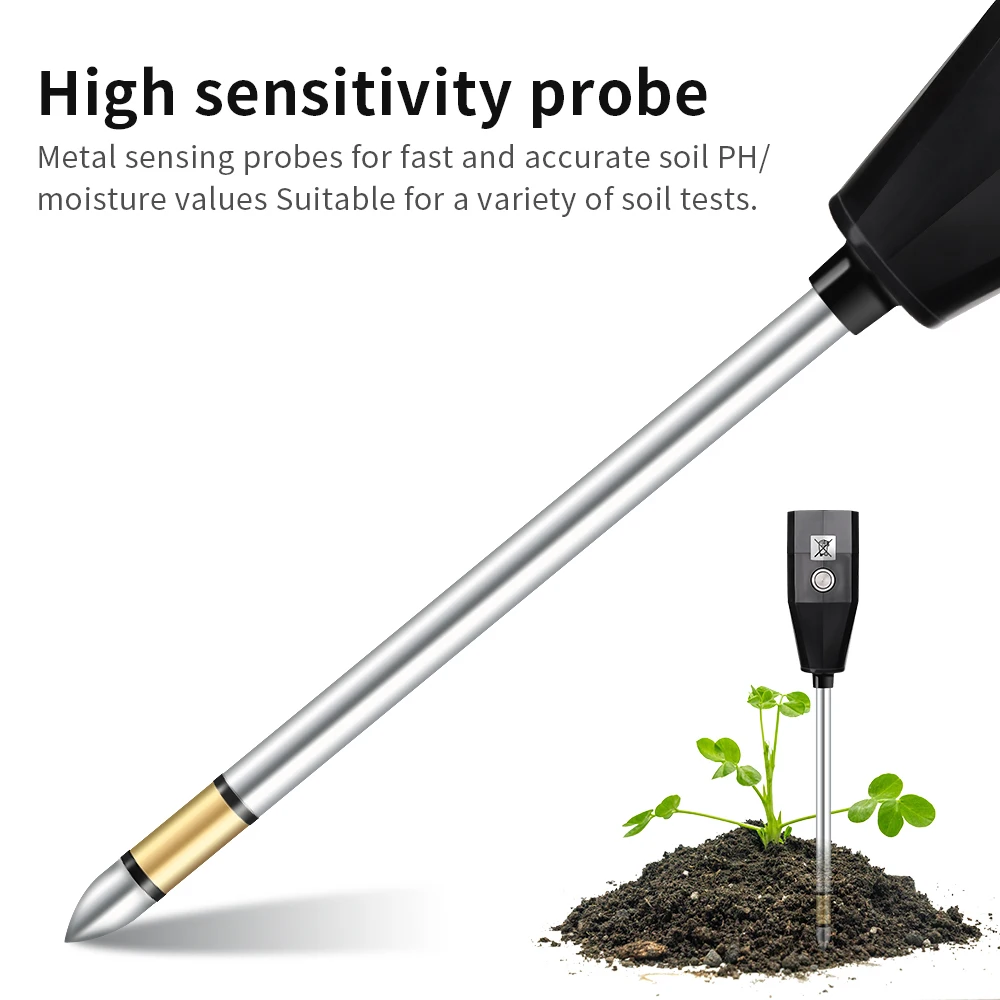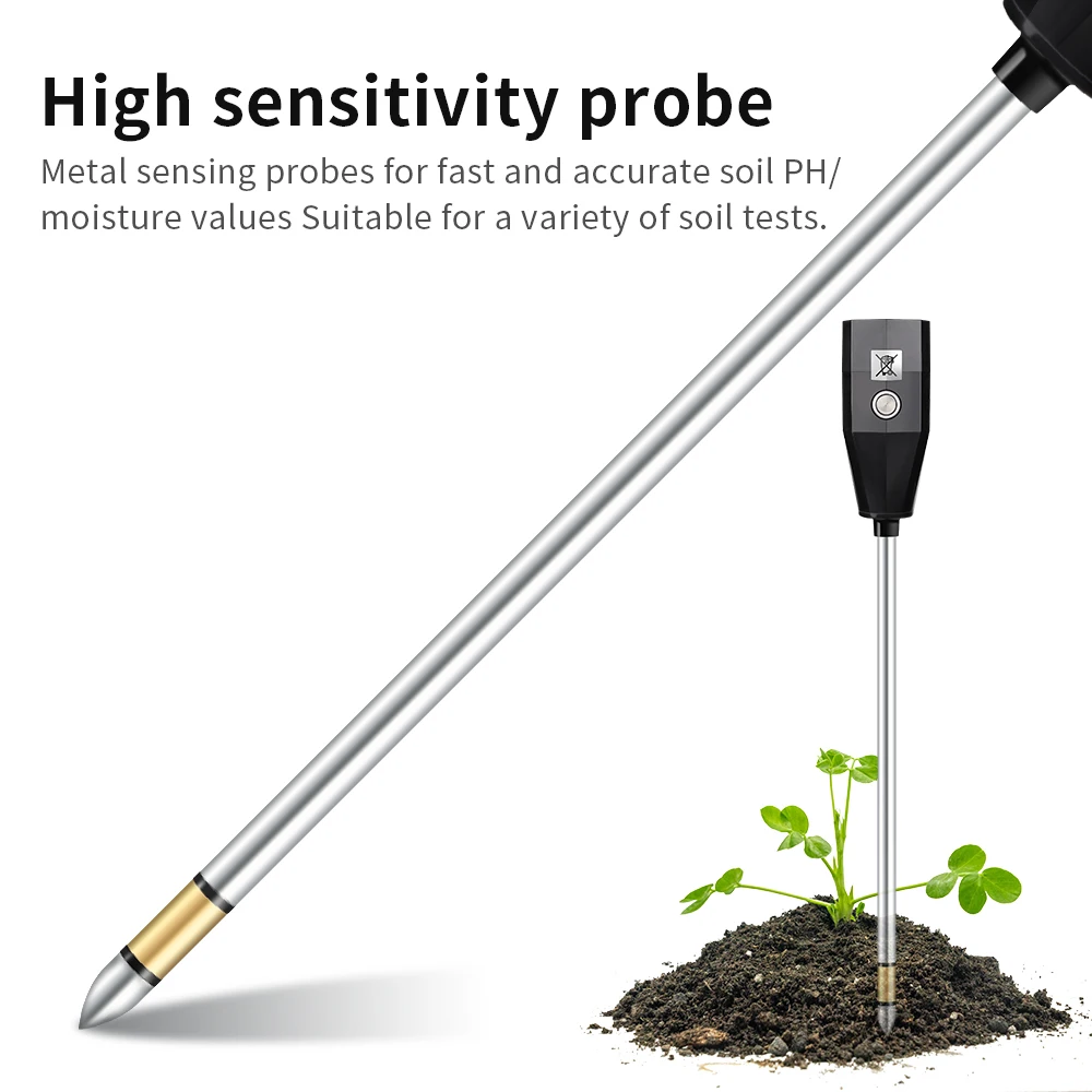 El pH del suelo juega un papel muy importante en el crecimiento de los cultivos alimentarios, y la mayoría de los cultivos tienen dificultades para sobrevivir en suelos que son altamente ácidos o alcalinos. Medir los niveles de pH y humedad en su suelo puede determinar cómo necesita ajustar la condición de su suelo para promover el crecimiento de las plantas. Este producto es versátil y se puede utilizar en viñedos, huertos, producción de campos, mantenimiento de césped, uso doméstico, jardines, plantaciones, mantenimiento de césped