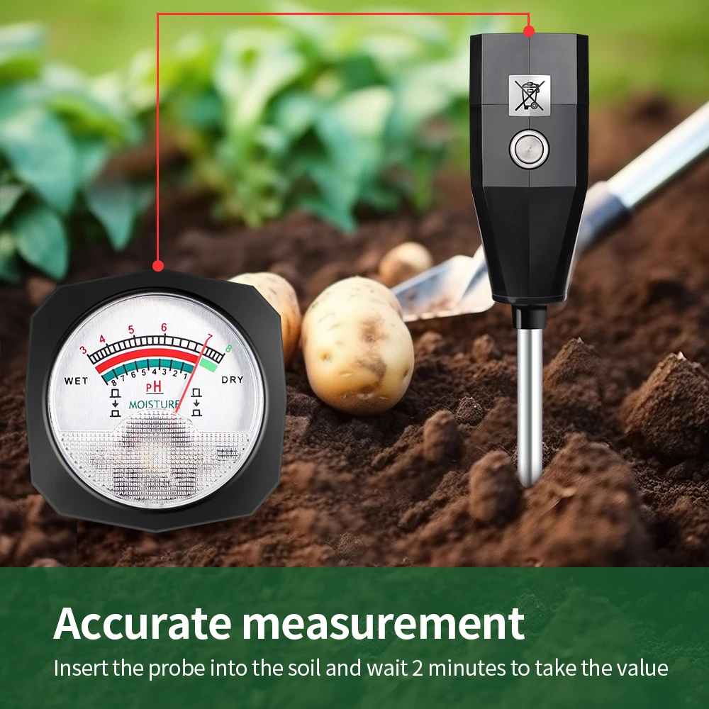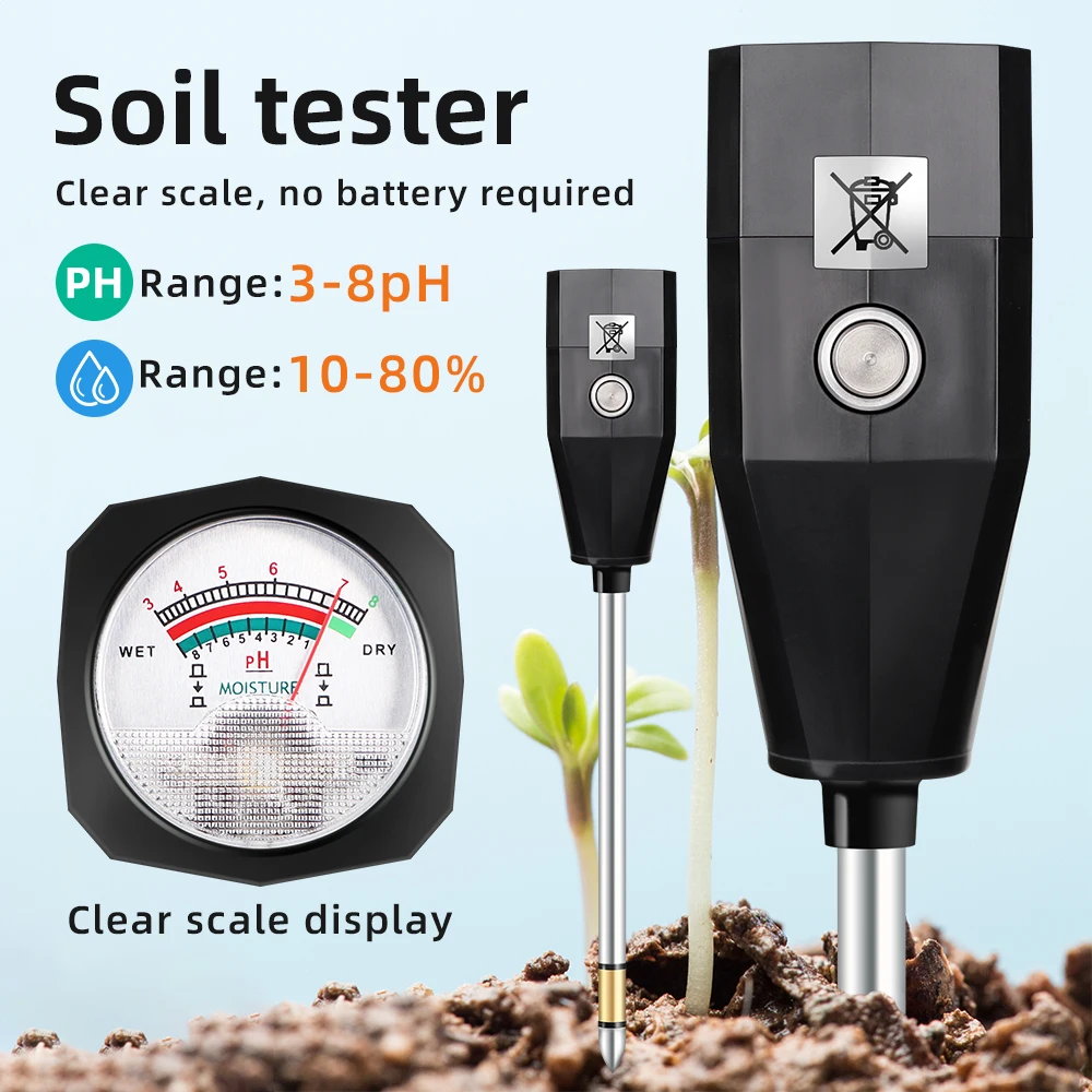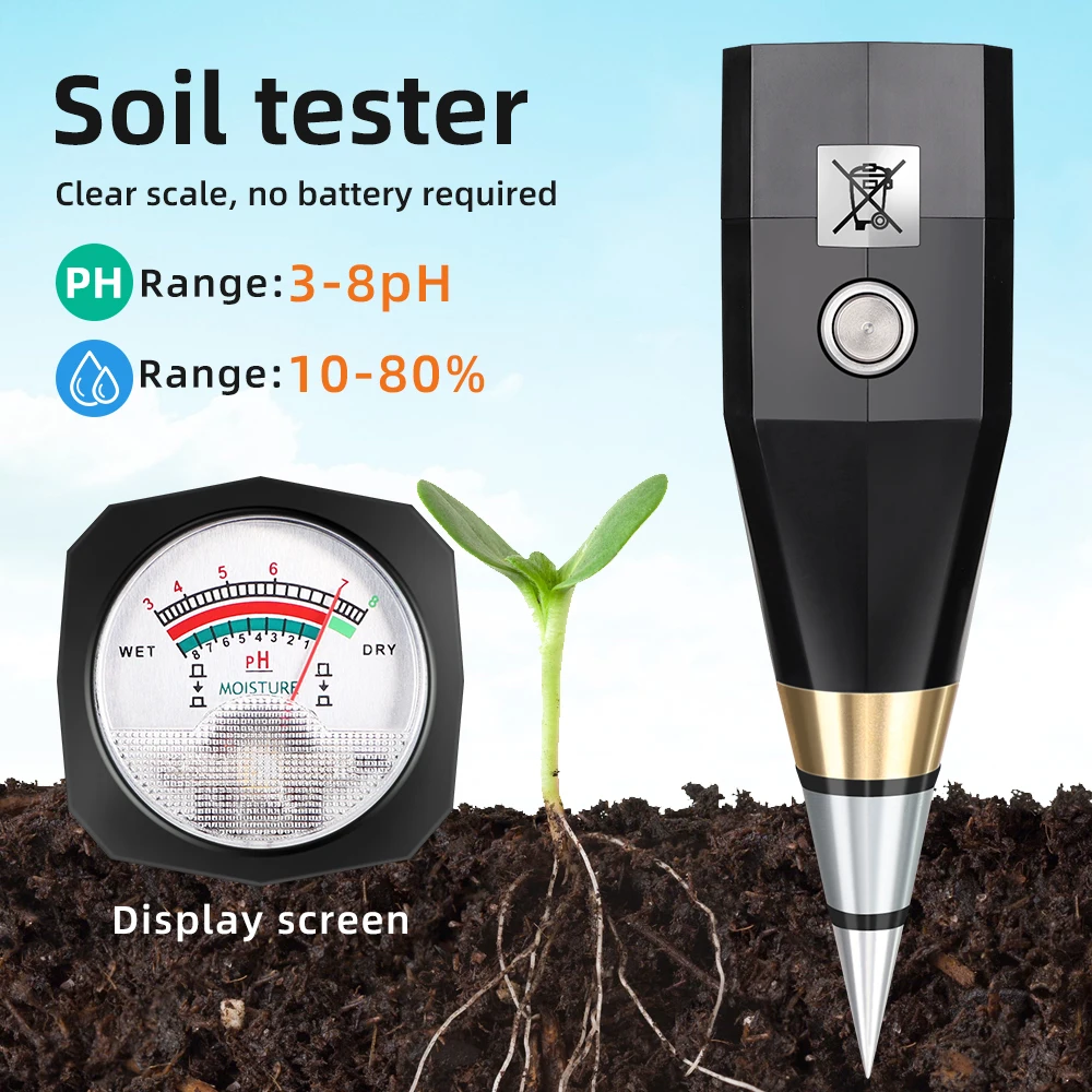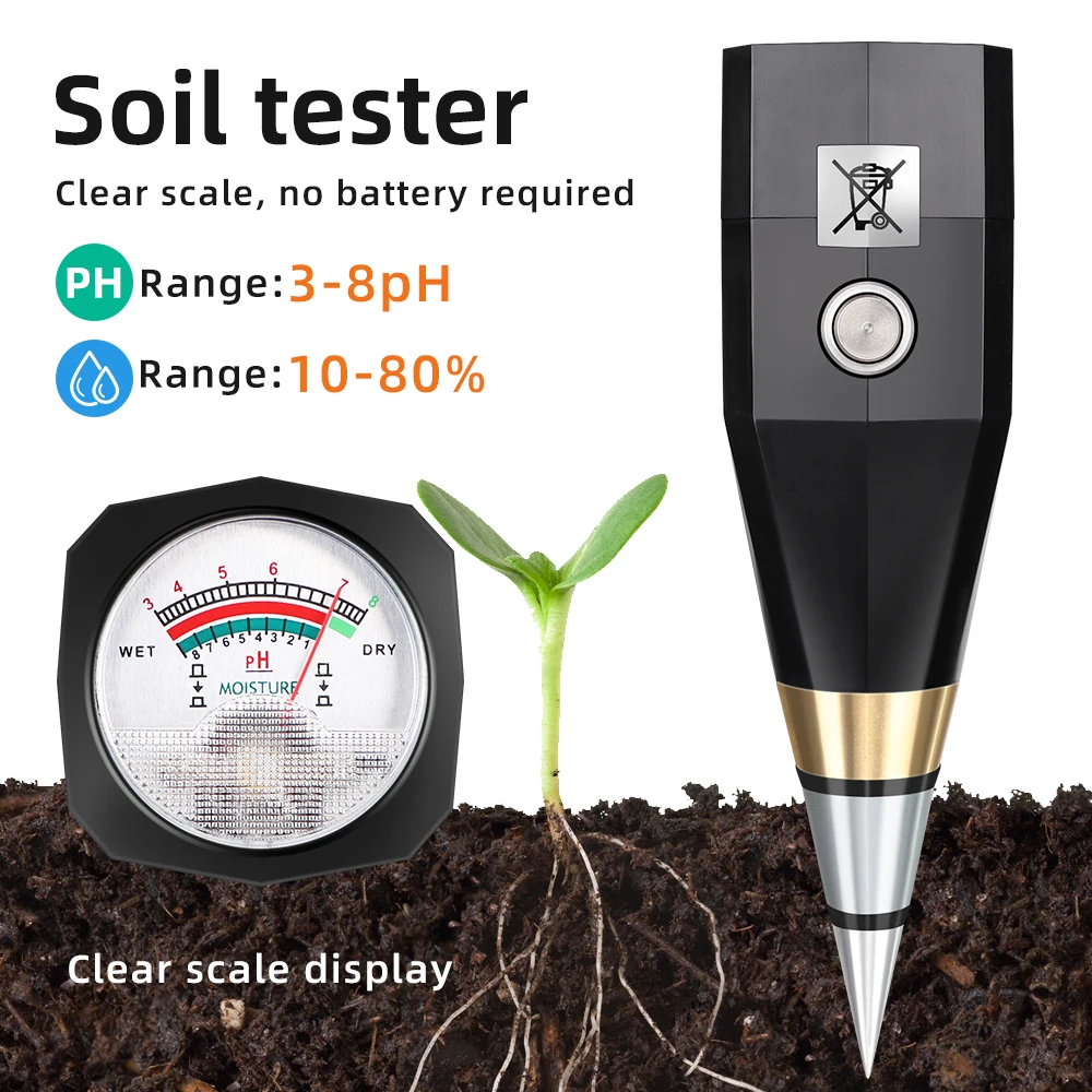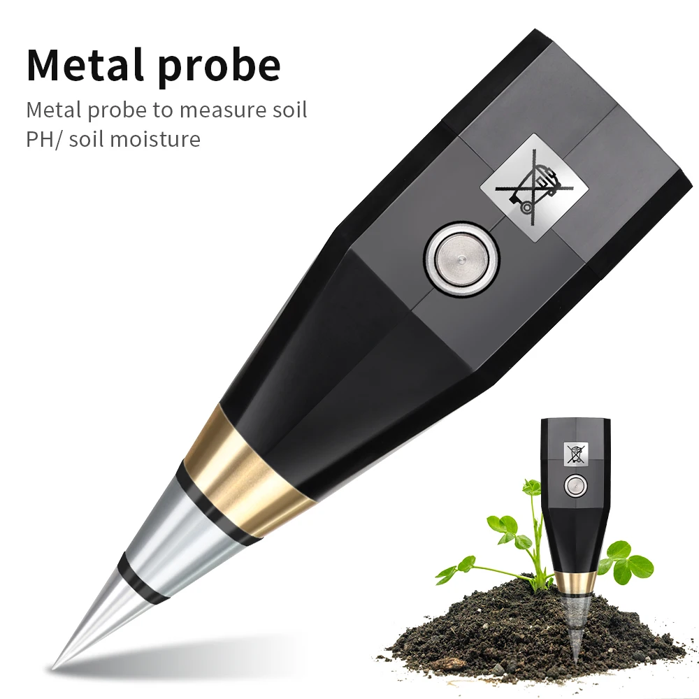 El pH del suelo juega un papel muy importante en el crecimiento de los cultivos alimentarios, y la mayoría de los cultivos tienen dificultades para sobrevivir en suelos que son altamente ácidos o alcalinos. Medir los niveles de pH y humedad en su suelo puede determinar cómo necesita ajustar la condición de su suelo para promover el crecimiento de las plantas. Este producto es versátil y se puede utilizar en viñedos, huertos, producción de campos, mantenimiento de césped, uso doméstico, jardines, plantaciones, mantenimiento de césped