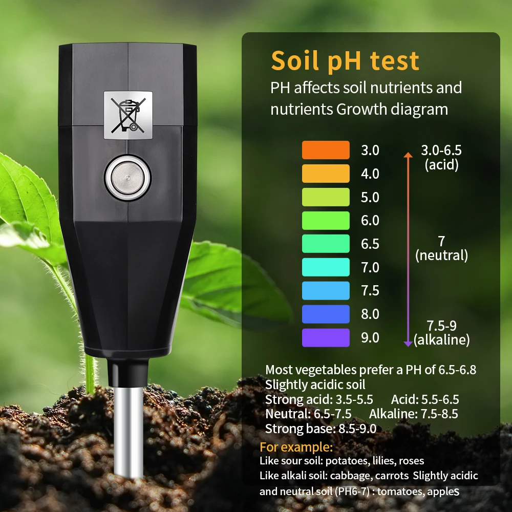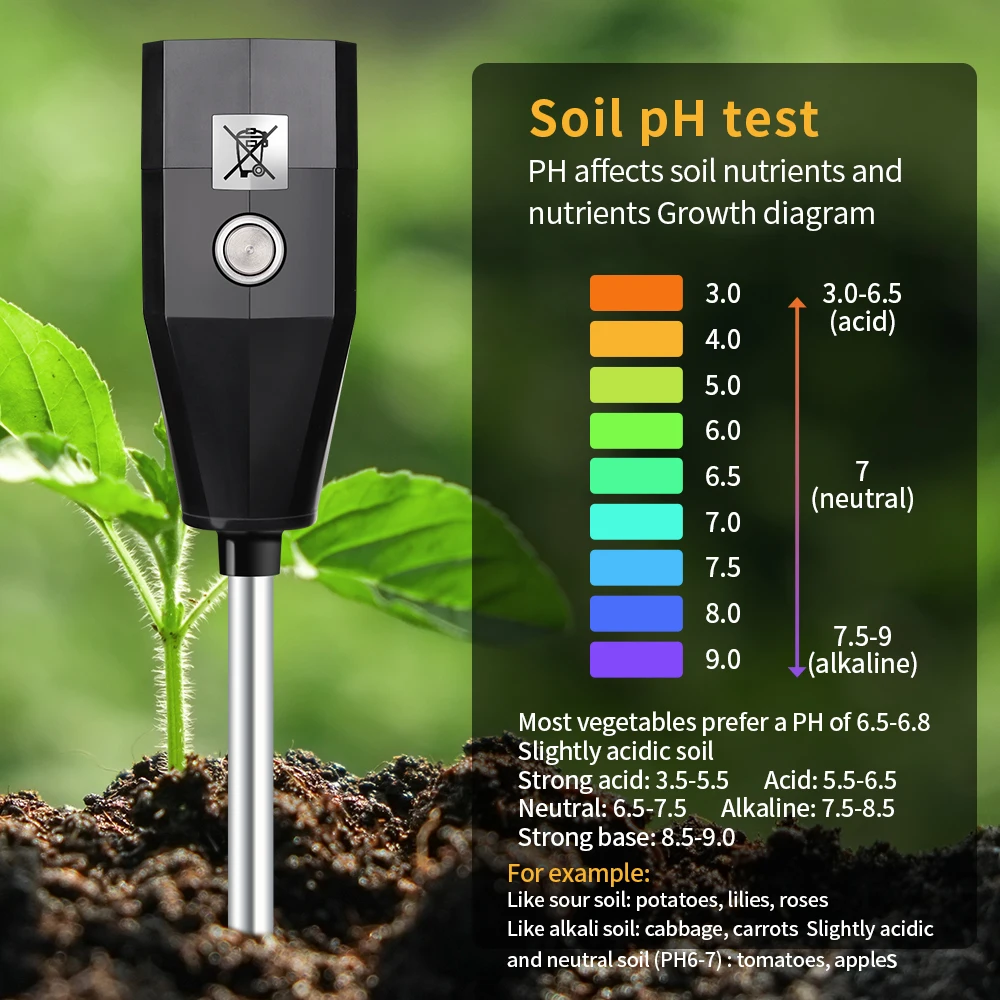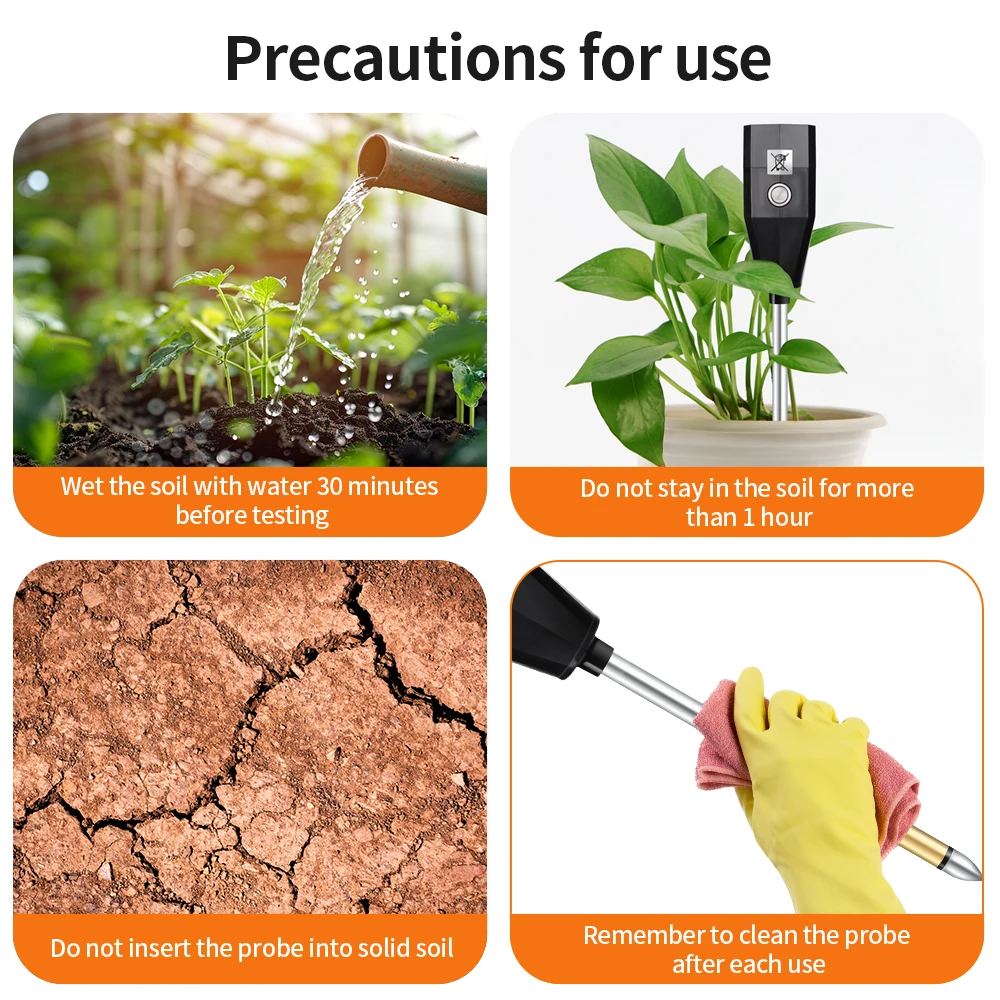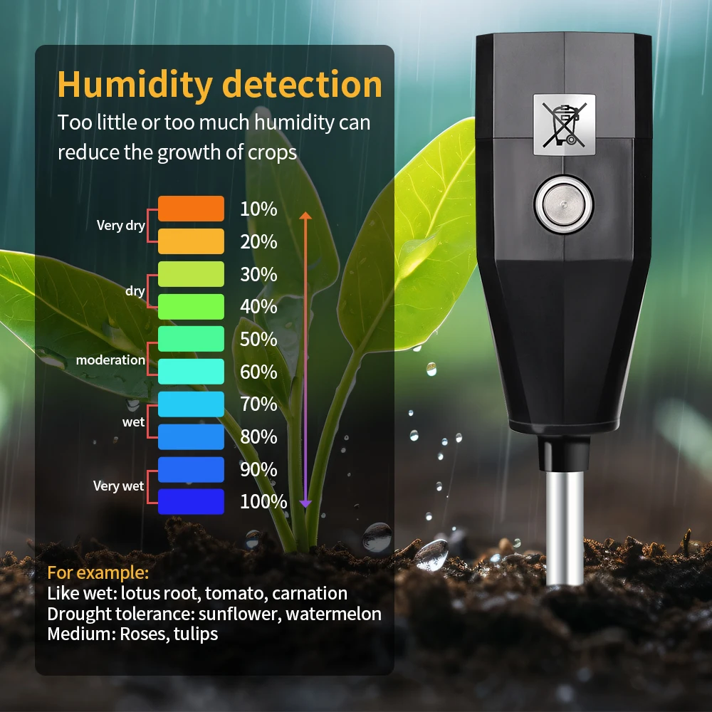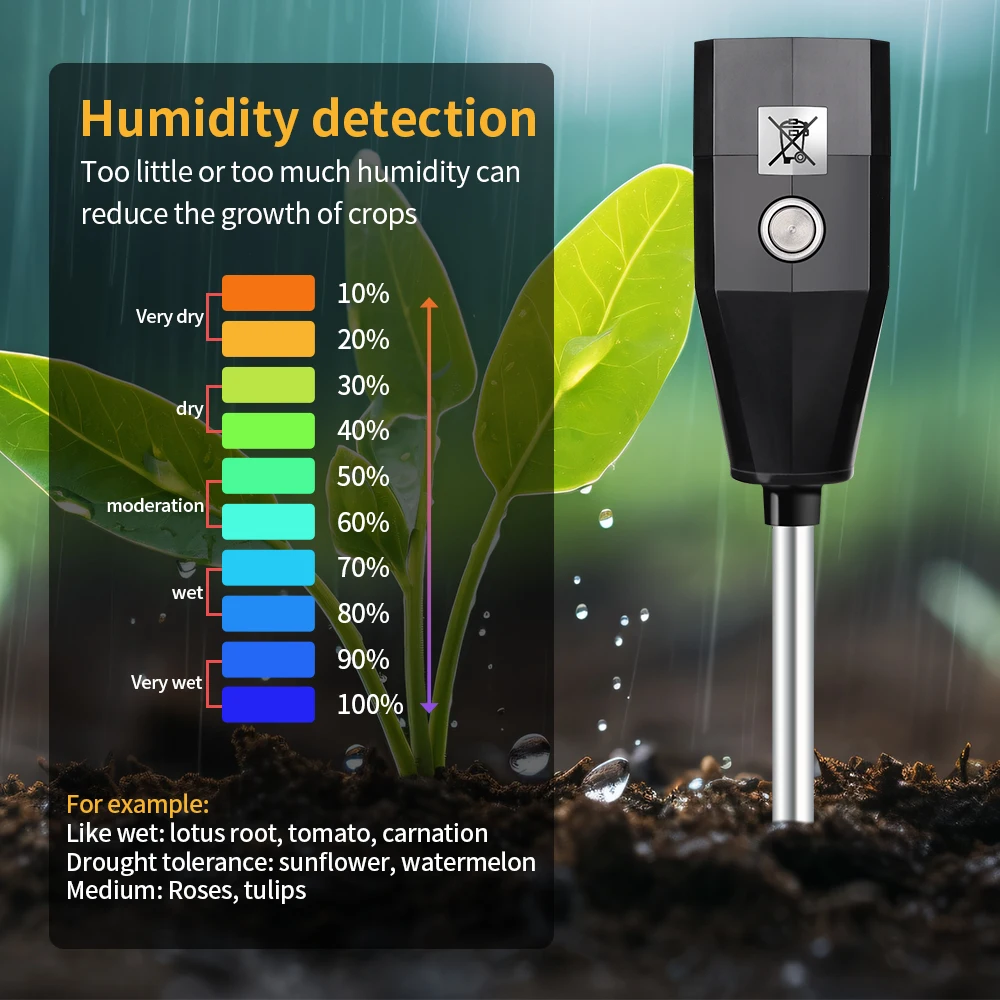 El pH del suelo juega un papel muy importante en el crecimiento de los cultivos alimentarios, y la mayoría de los cultivos tienen dificultades para sobrevivir en suelos que son altamente ácidos o alcalinos. Medir los niveles de pH y humedad en su suelo puede determinar cómo necesita ajustar la condición de su suelo para promover el crecimiento de las plantas. Este producto es versátil y se puede utilizar en viñedos, huertos, producción de campos, mantenimiento de césped, uso doméstico, jardines, plantaciones, mantenimiento de césped