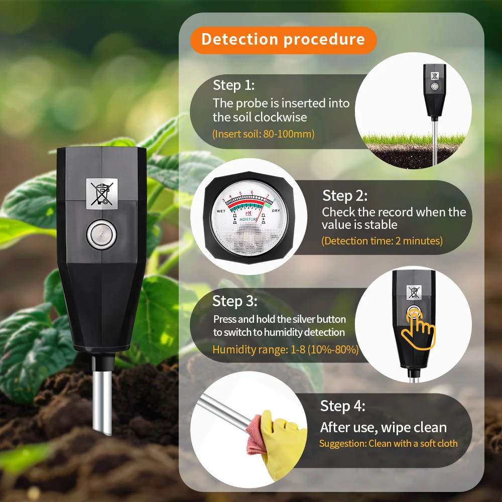 3. 2 en 1 Función, puede medir el valor de pH y el valor de humedad del suelo, una máquina para dos protecciones económicas y ambientales.