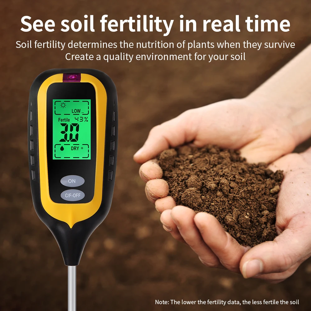 El medidor de suelo 6 en 1 puede medir la relación entre humedad, valor de PH, humedad ambiental, detección de temperatura, fertilidad del suelo e intensidad de la luz solar del suelo.La pantalla LCD grande muestra varias lecturas.El departamento también tiene un indicador de baja potencia y una función de apagado automático.Es energéticamente eficiente.El dispositivo garantiza una calidad de plantación de flores y plantas y paisajismo.