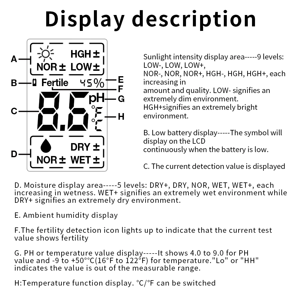 【Fácil de usar】Simplemente conecte la sonda al suelo unos 4 pulgadas (10 cm), espere 10 segundos para leer datos intuitivos y obtendrá una lectura precisa y precisa de inmediato.Solo es necesario quitar la sonda del suelo y limpiarla después de usarla.