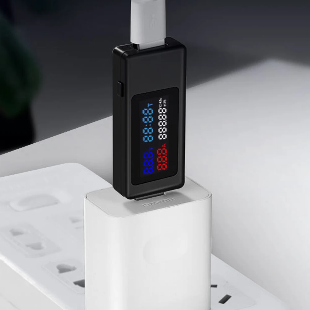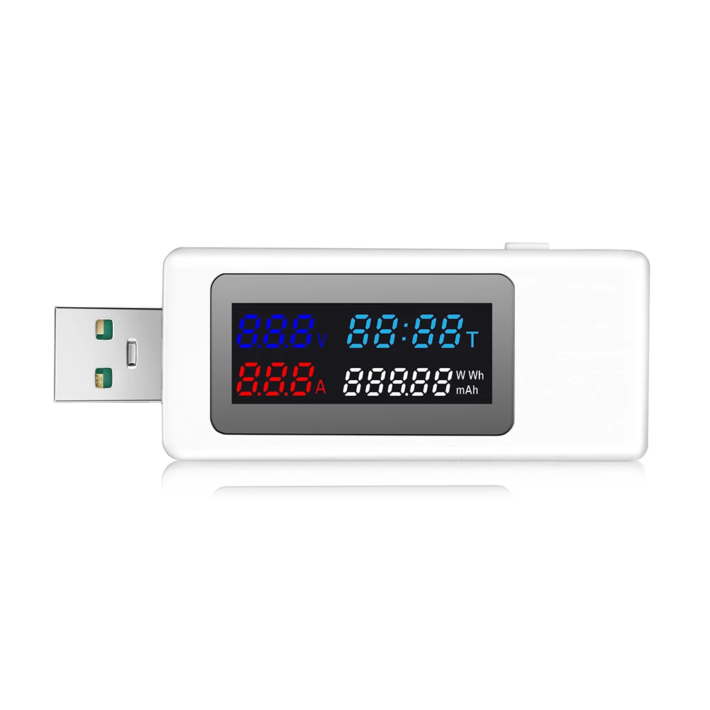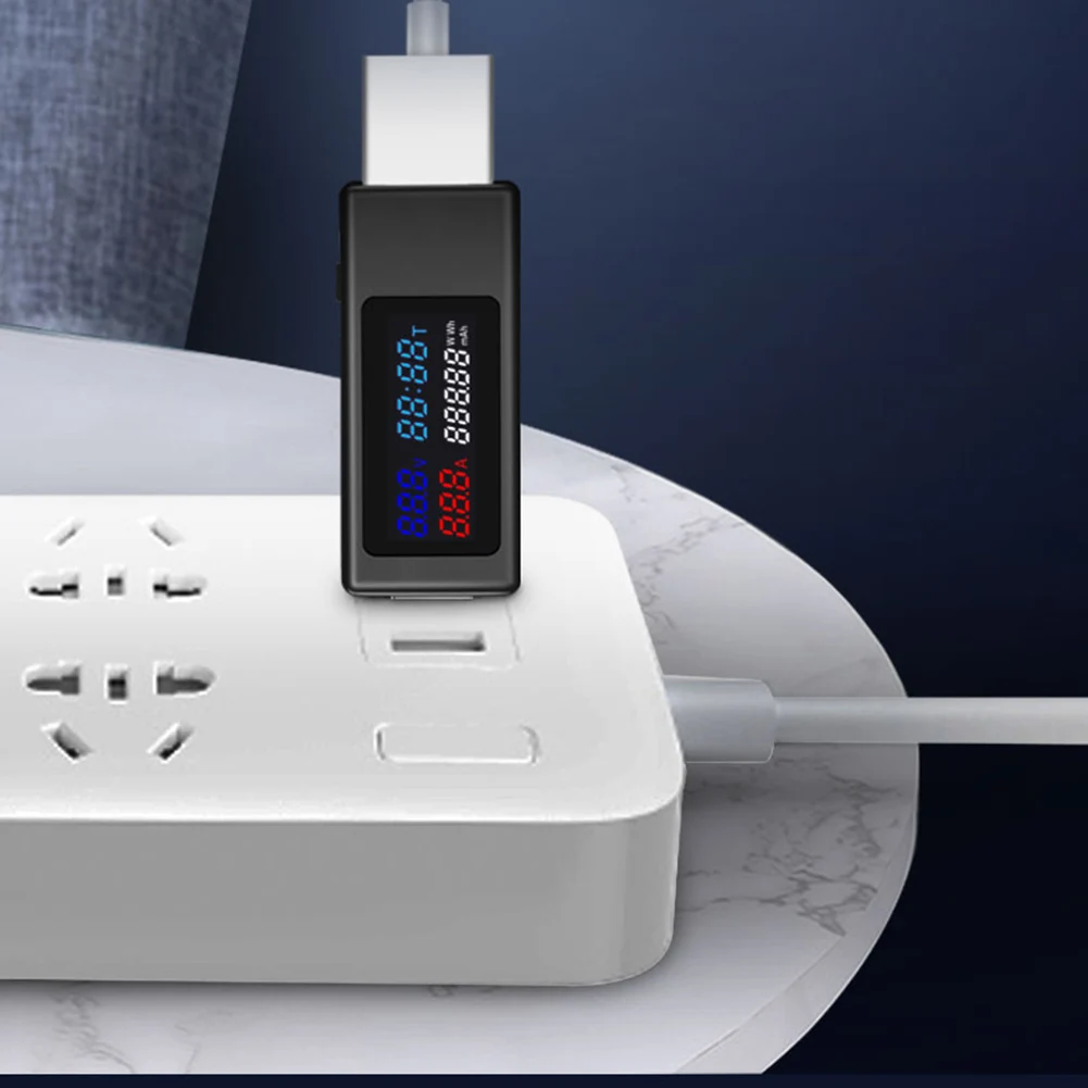 Probador USB con pantalla 6 en 1 para corriente, voltaje, sincronización, potencia, capacidad y electricidad.