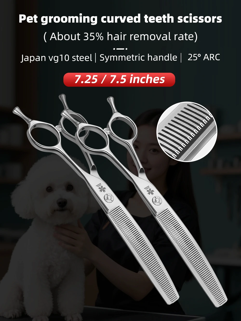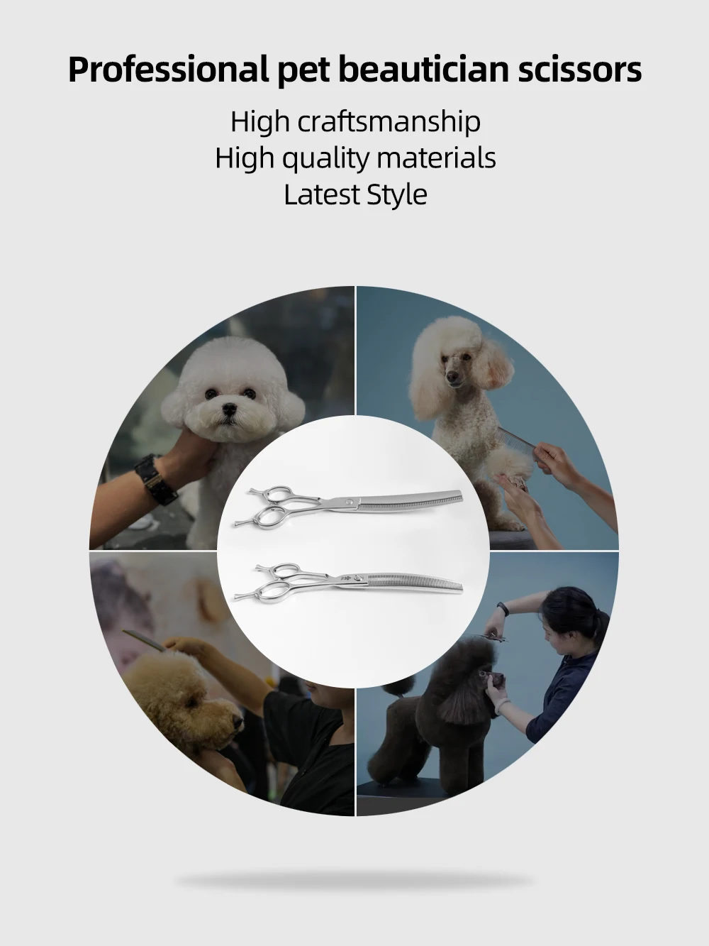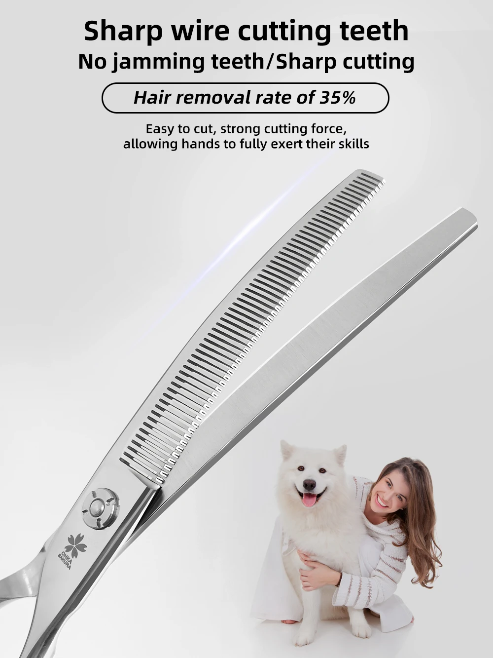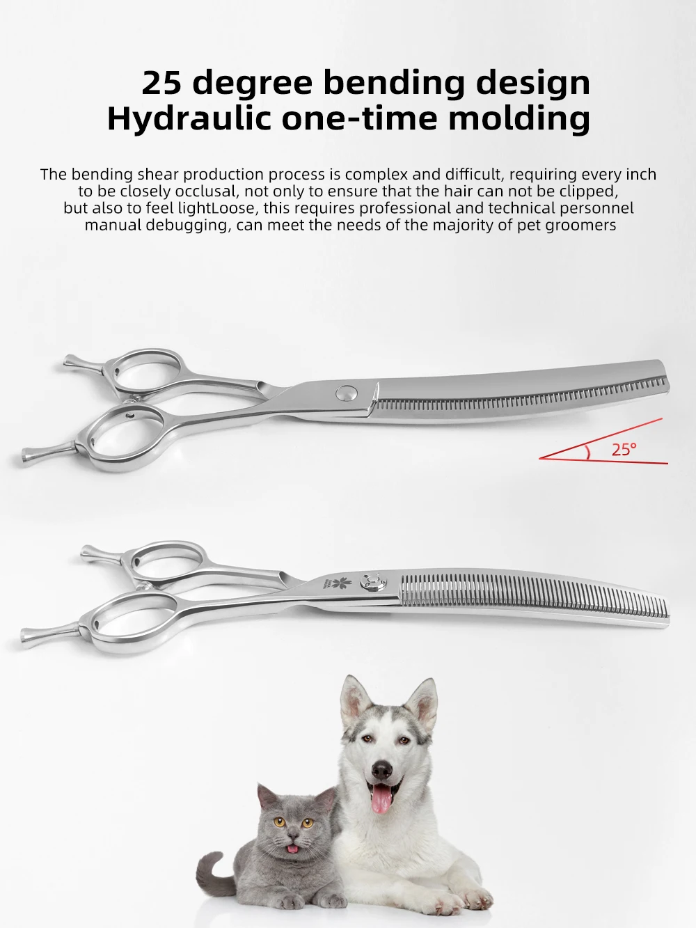 Con un diseño de adelgazamiento curvo, estas tijeras son perfectas para sesiones profesionales de cuidado de perros.