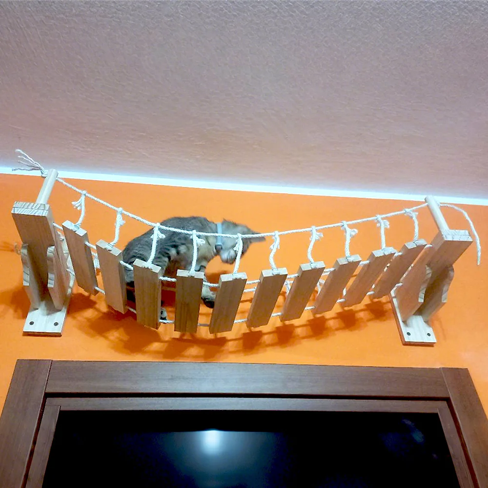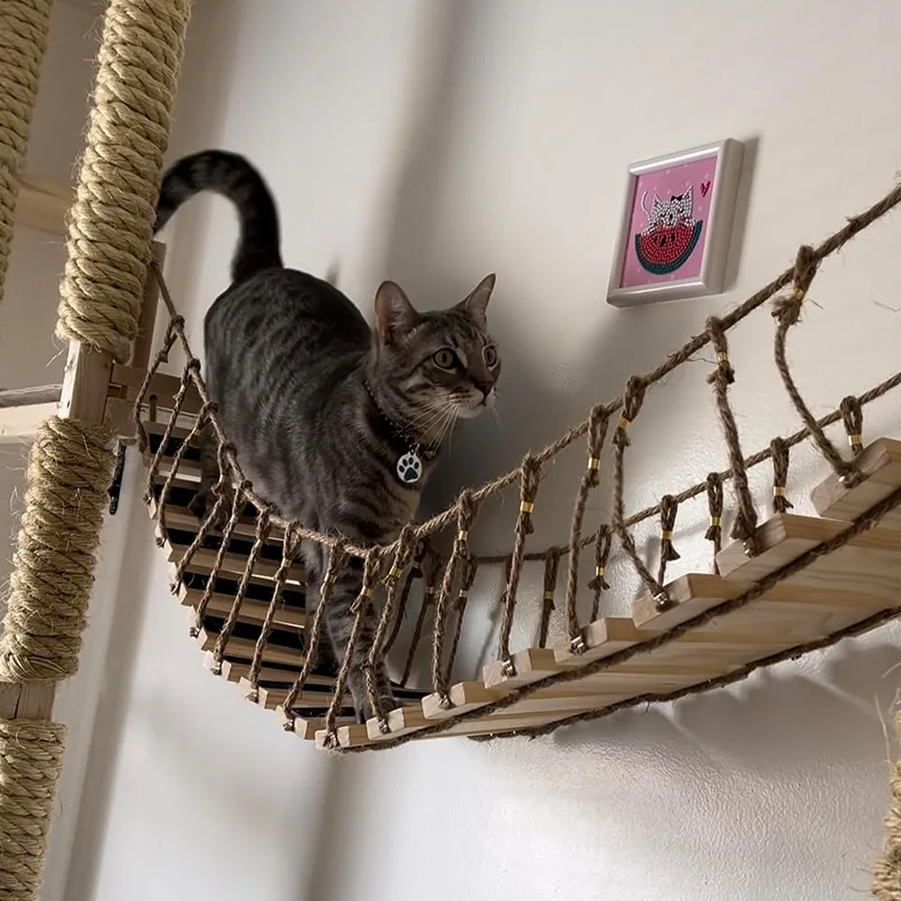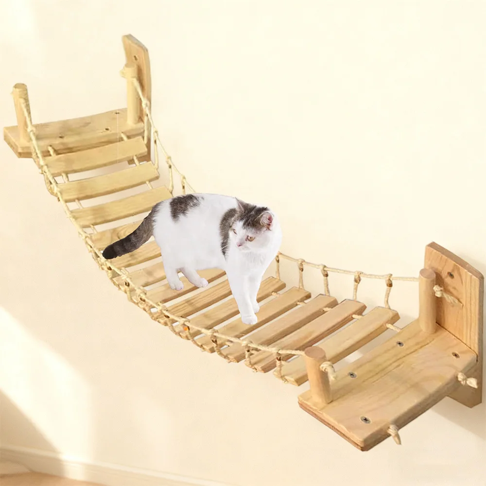 Puente de madera maciza montado en la pared para gatos, puente de juego colgante para gatos con cuerda, accesorios interactivos para gatos de interior para gatitos y gatos adultos