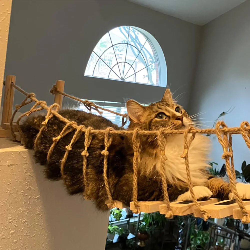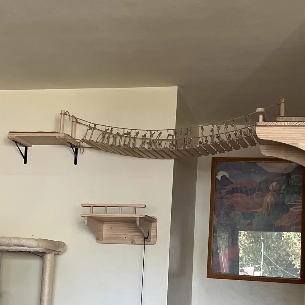 Este puente trepador de madera para gatos está hecho de madera natural de alta calidad con vetas claras y textura sólida, que tiene buena capacidad de carga y durabilidad.Cada tabla de madera ha sido finamente pulida, con una superficie lisa y sin rebabas, cuidando las delicadas patas de los gatos.Combinado con cuerdas resistentes y duraderas, tejidas en una estructura de malla estable que puede soportar el peso de los gatos que caminan, descansan y juegan libremente sobre ella, sin deformarse ni dañarse.