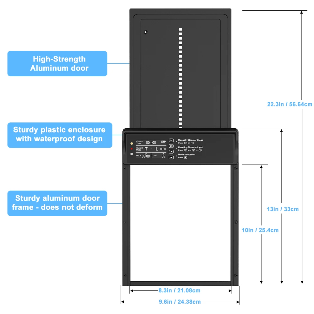 2. 【Control remoto y manual】: la puerta automática para pollos admite hasta 15 metros de distancia de control remoto, así como configuraciones manuales en el panel de la puerta para pollos, lo que brinda gran flexibilidad y conveniencia.Incluso en un día frío, puedes controlarlo de forma remota desde tu puerta.Y tenga en cuenta que cuando utilice el control remoto por primera vez, abra la tapa de la batería en la parte posterior para quitar la cinta de bloqueo de energía del interior.