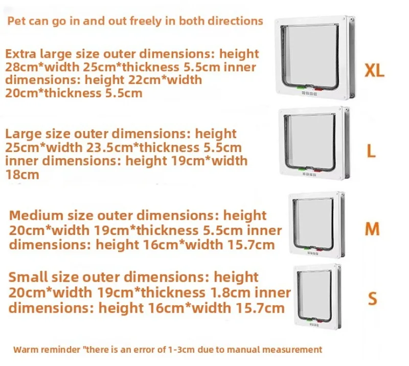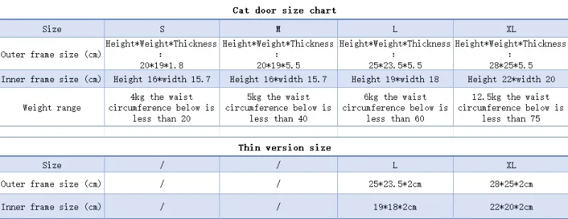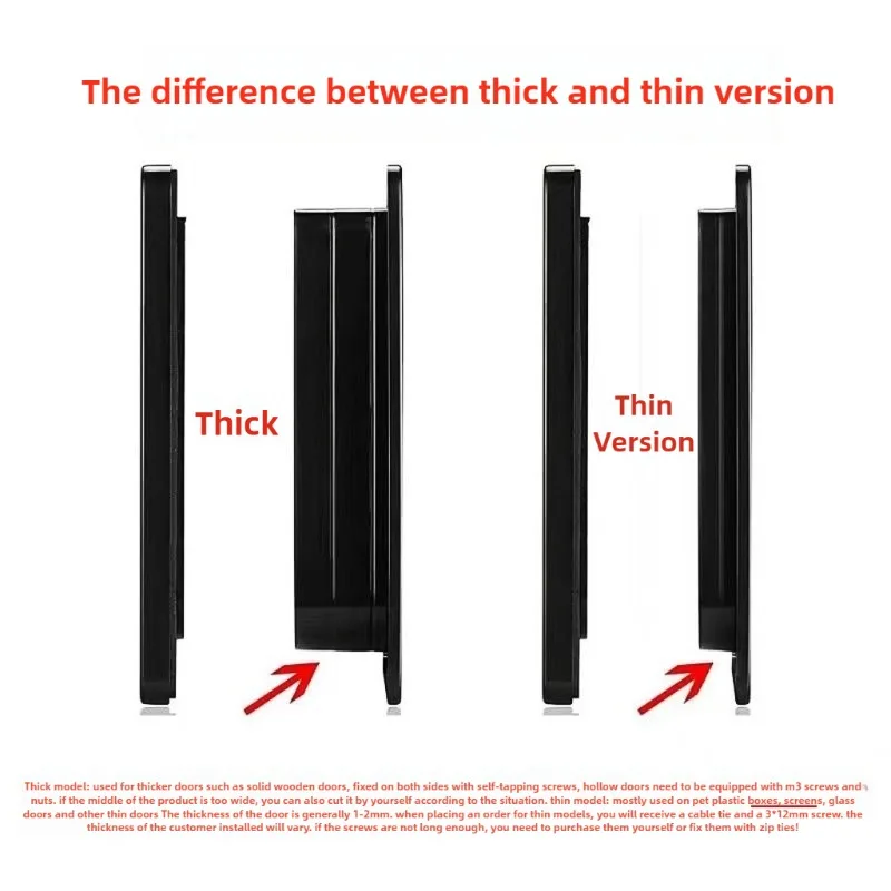 Recordatorio: Los tornillos del producto son distribuidos uniformemente por la fábrica, porque el grosor de cada puerta definitivamente será diferente.Si los tornillos no son adecuados durante la instalación, debe comprarlos por separado.¡Por favor sepa!El grosor de los otros tamaños grandes y medianos se puede cortar fino.Si el grosor de la puerta de la casa es inferior a 5 cm, córtela usted mismo con unas tijeras.¡¡¡Está bien con una marca de escala!!!Además, la puerta para gatos de tamaño pequeño solo tiene cuatro orificios para tornillos en el panel principal y no hay orificios para tornillos en el panel posterior, porque este pequeño se instala principalmente en puertas y ventanas de vidrio, debe pegarse con pegamento y el pegamento debe comprarse usted mismo.¡El panel posterior solo tiene un efecto hermoso!!