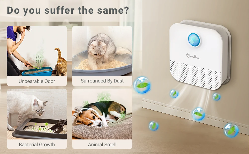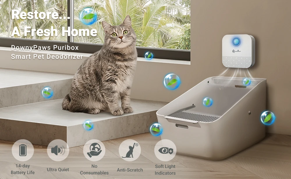 El desodorizador de arena para gatos DownyPaws es un nuevo modo de eliminador de olores en el mercado, que utiliza una nueva tecnología de descomposición iónica para eliminar y controlar el olor hasta un 90%. Está especialmente diseñado para gatos, cachorros o cualquier espacio pequeño, como una caja de arena para gatos o una jaula para perros.