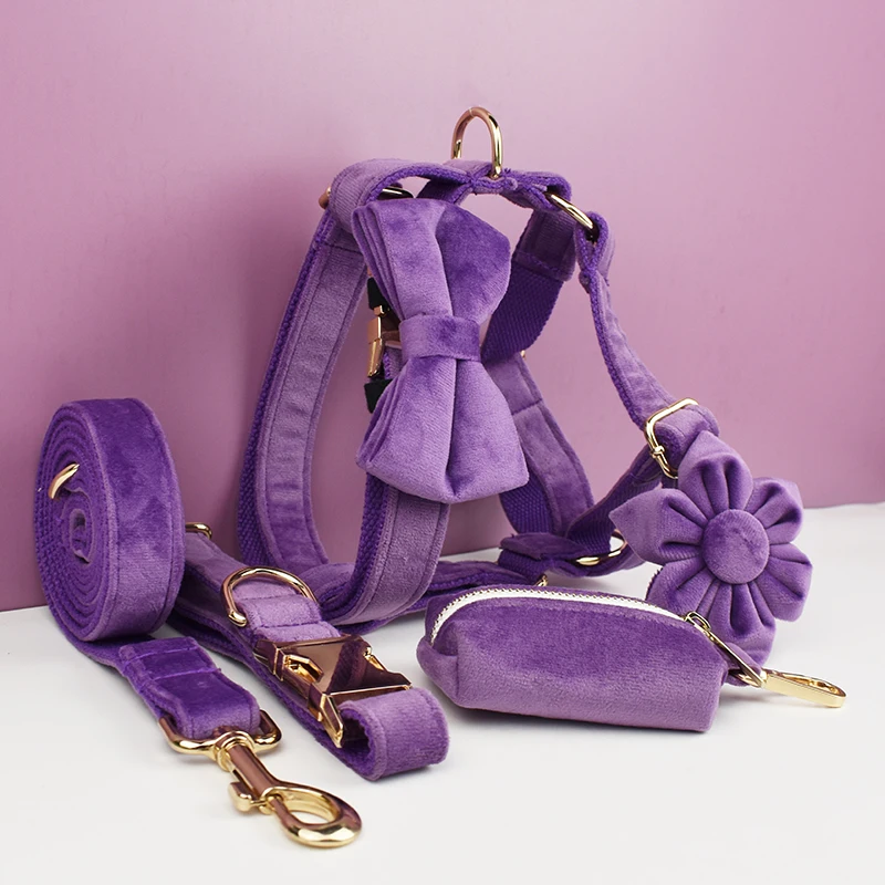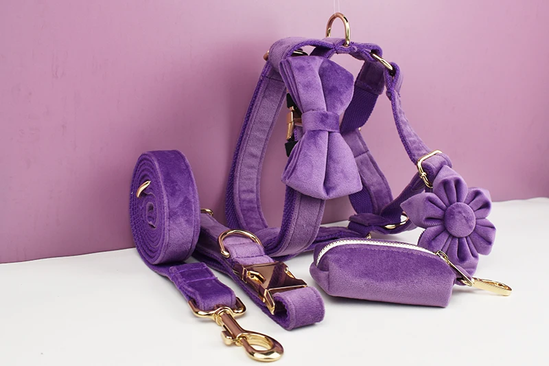 Juego de collar y correa de terciopelo morado para perros pequeños, medianos y grandes, placa de identificación grabada personalizada, suministros para mascotas, correa para perros de terciopelo 16