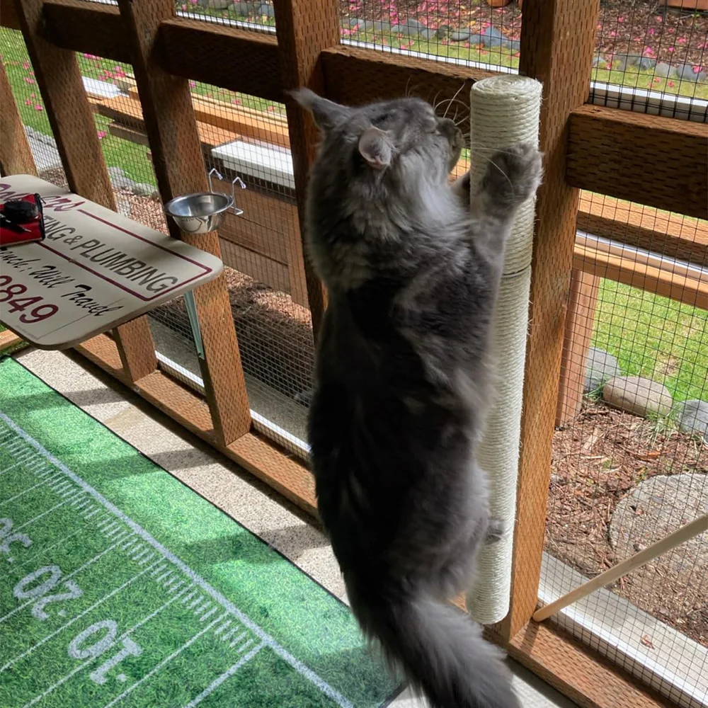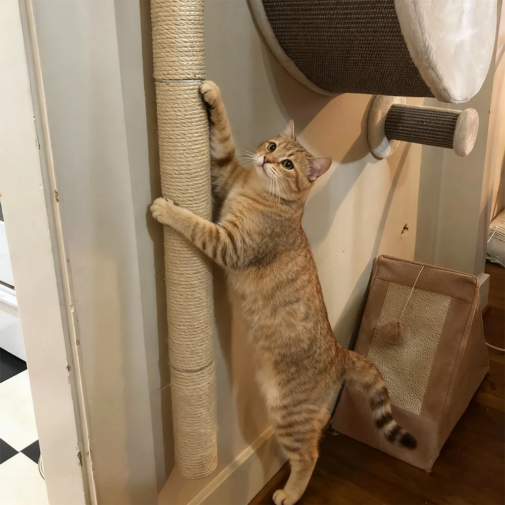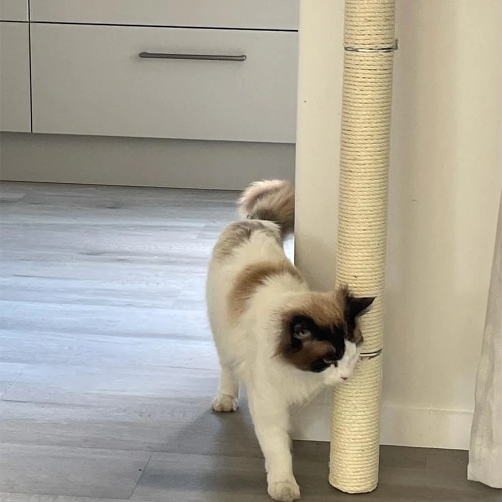 A los gatos les gusta naturalmente rascarse las patas, y este palo con garra para gatos les proporciona un excelente lugar para afilar sus patas. Los gatos pueden estirar sus cuerpos libremente, trepar y rascarse hacia arriba, satisfaciendo plenamente sus necesidades físicas y naturales. Al utilizar postes rascadores para gatos, los gatos pueden liberar eficazmente su energía y reducir los comportamientos destructivos causados por el aburrimiento o la energía excesiva, como rascadores de sofás, cortinas, etc. Además, rascar frecuentemente el rascador del gato puede ejercitar la coordinación de las extremidades y la fuerza muscular del gato, manteniéndolo en un estado saludable y animado.