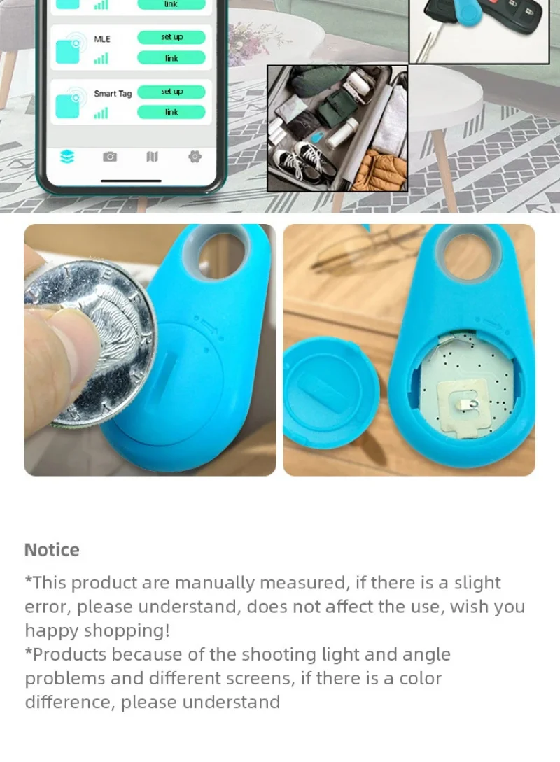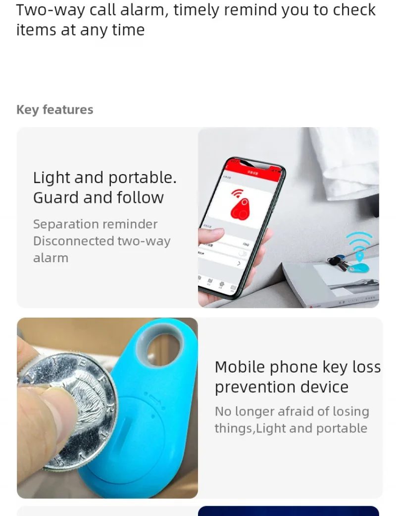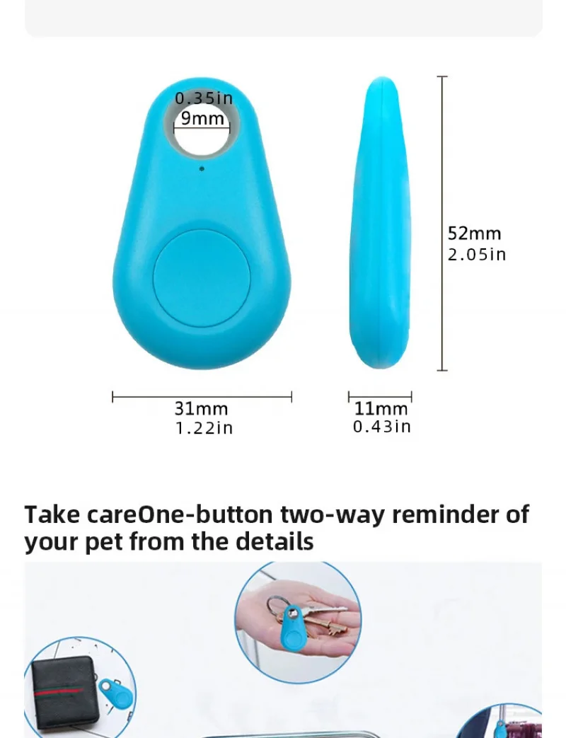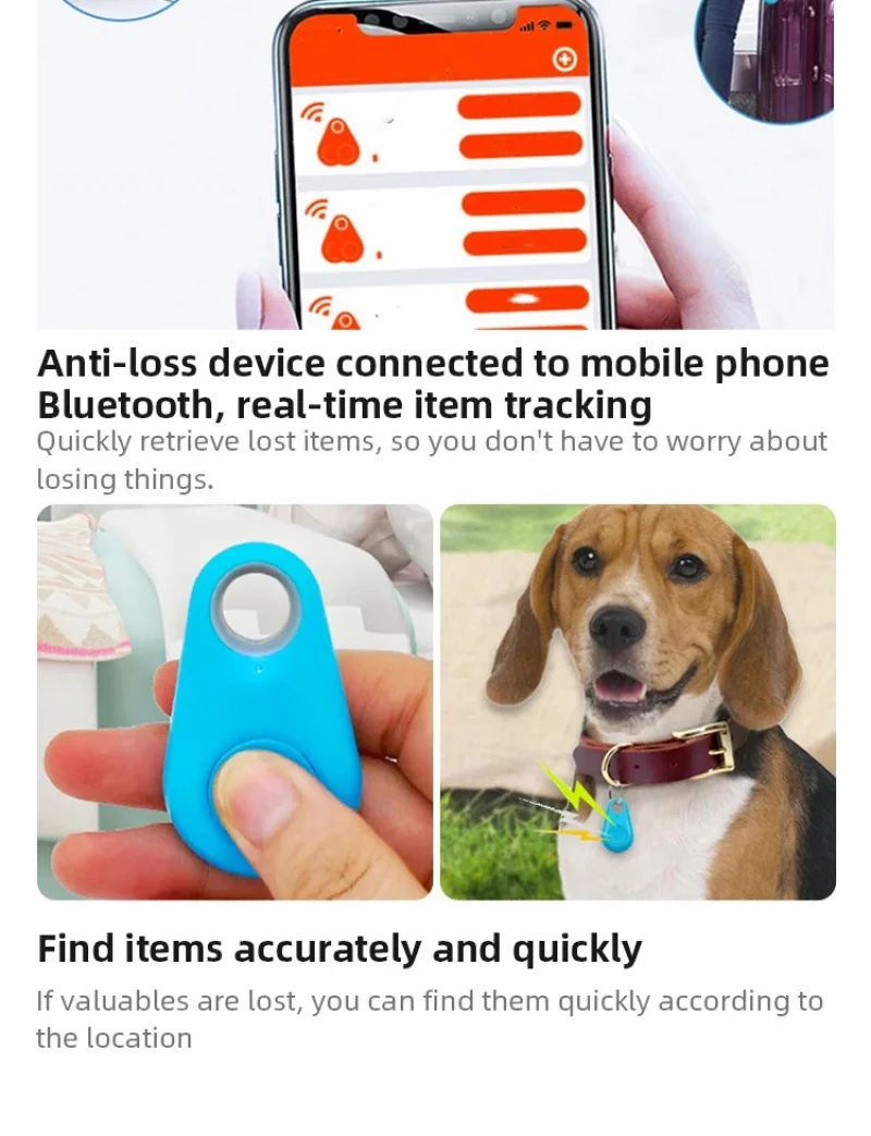 Dispositivo antipérdida Bluetooth con mascotas, llaves, bolsos, etc., el viaje también se puede utilizar de forma remota con un temporizador automático, muy conveniente.