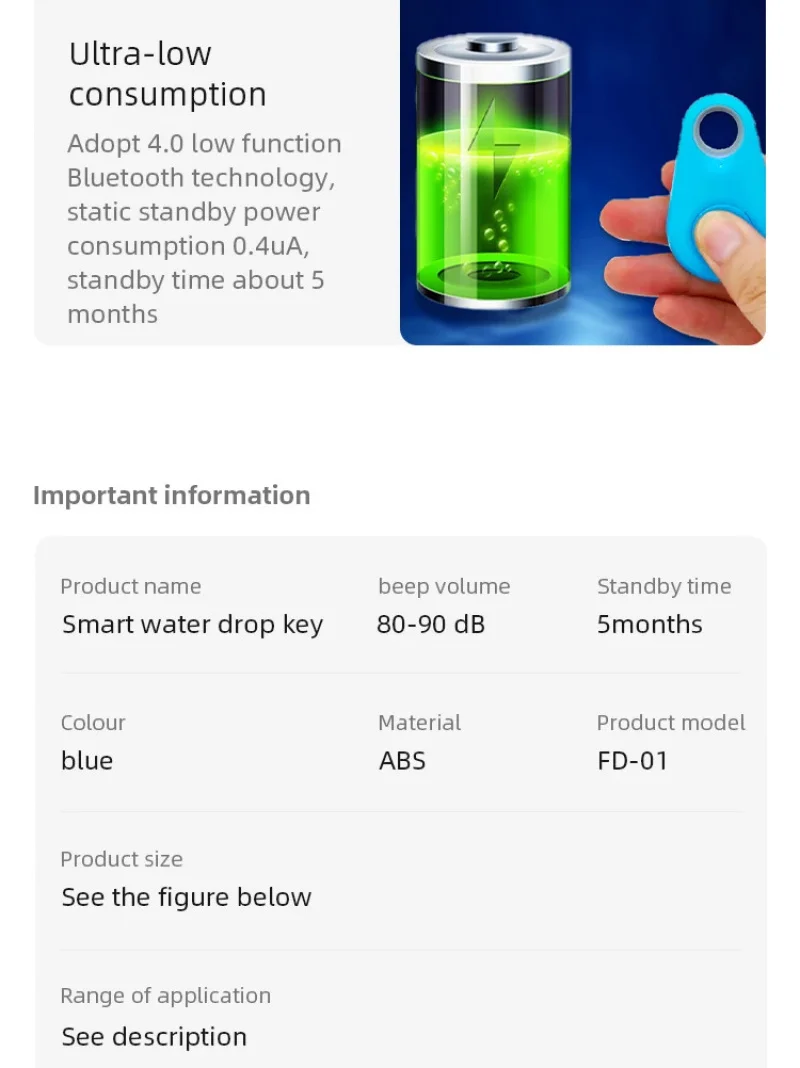 Utilizando nueva tecnología Bluetooth, consumo de energía muy bajo, fuente de alimentación CR2032 con batería de botón, en espera de 2-3 meses o más, fácil de reemplazar.