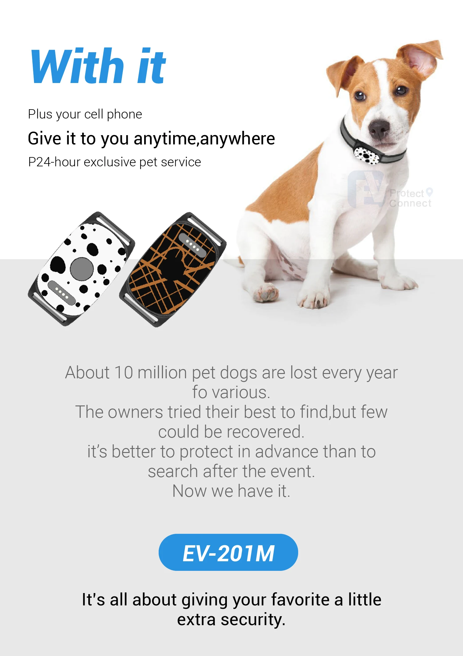 Nuestro EV-201M es un dispositivo GPS/GSM que se conecta al collar de su mascota. le permite definir una zona segura en su hogar y recibir instantáneamente alertas de texto y correo electrónico cuando su mascota abandona esa zona. Utilice la potencia de la tecnología GPS, GSM y BLE 4.0 para saber si salen y los encuentre rápidamente para recuperarlos de forma segura. El dispositivo Pet Tracking le ayuda a localizar a su perro, su gato o cualquier otra mascota, en cualquier momento y en cualquier lugar.