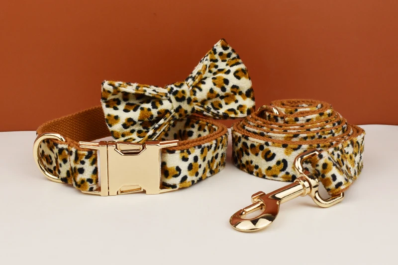 Recién llegado, logotipo de diseñador personalizado, estampado de leopardo en Base marrón, Collar de perro de algodón suave, correas, arnés, soporte para bolsa de caca, conjunto de arco