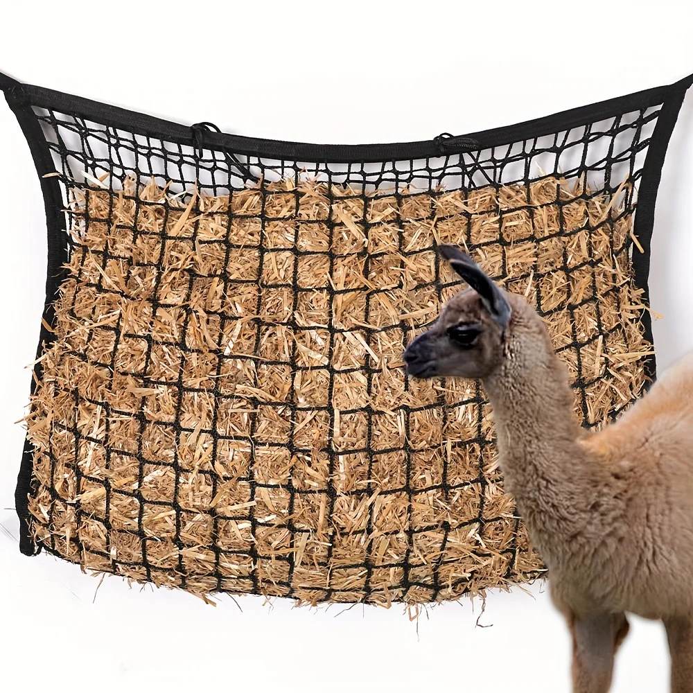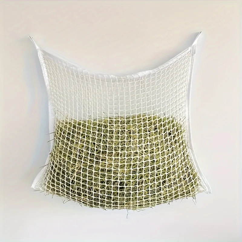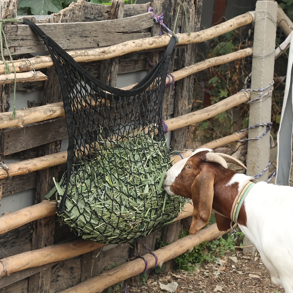 Bolsa: La red de heno tiene una red de malla fina, un proceso de tejido sin enredos, nudos fuertes y sin nudos sueltos, fuerza uniforme en la superficie de la red, resistencia al desgarro y alta capacidad de carga, adecuada para caballos, ponis, cabras y muchos otros animales..