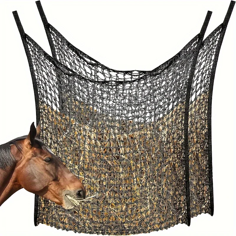 Red de heno para caballos: el tamaño de la red de heno es de 90 x 60 cm.Debido a la pequeña malla de la red de heno para caballos, el caballo sólo puede sacar una porción muy pequeña de la red y cuidar los animales con su comportamiento natural.como un comedor constante.