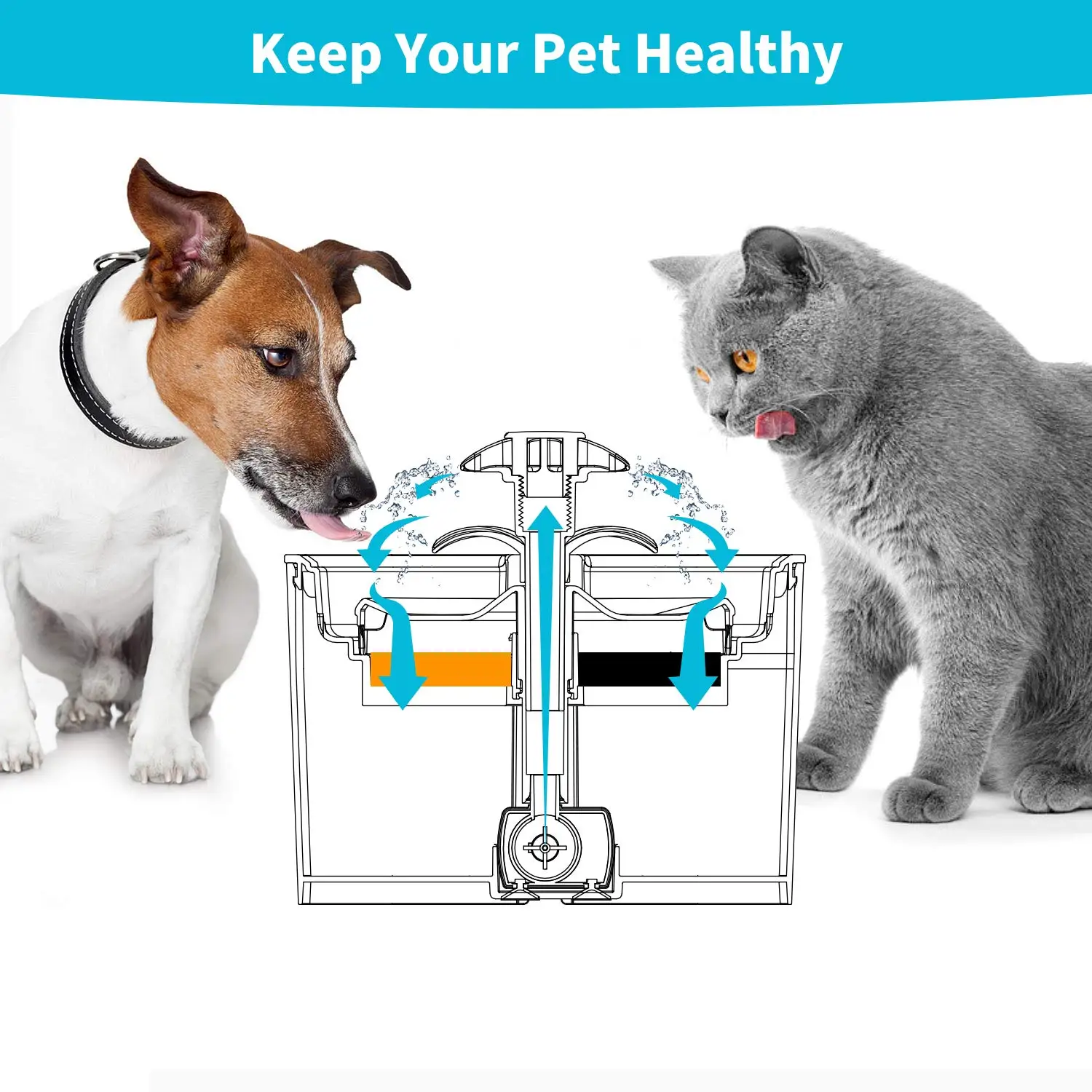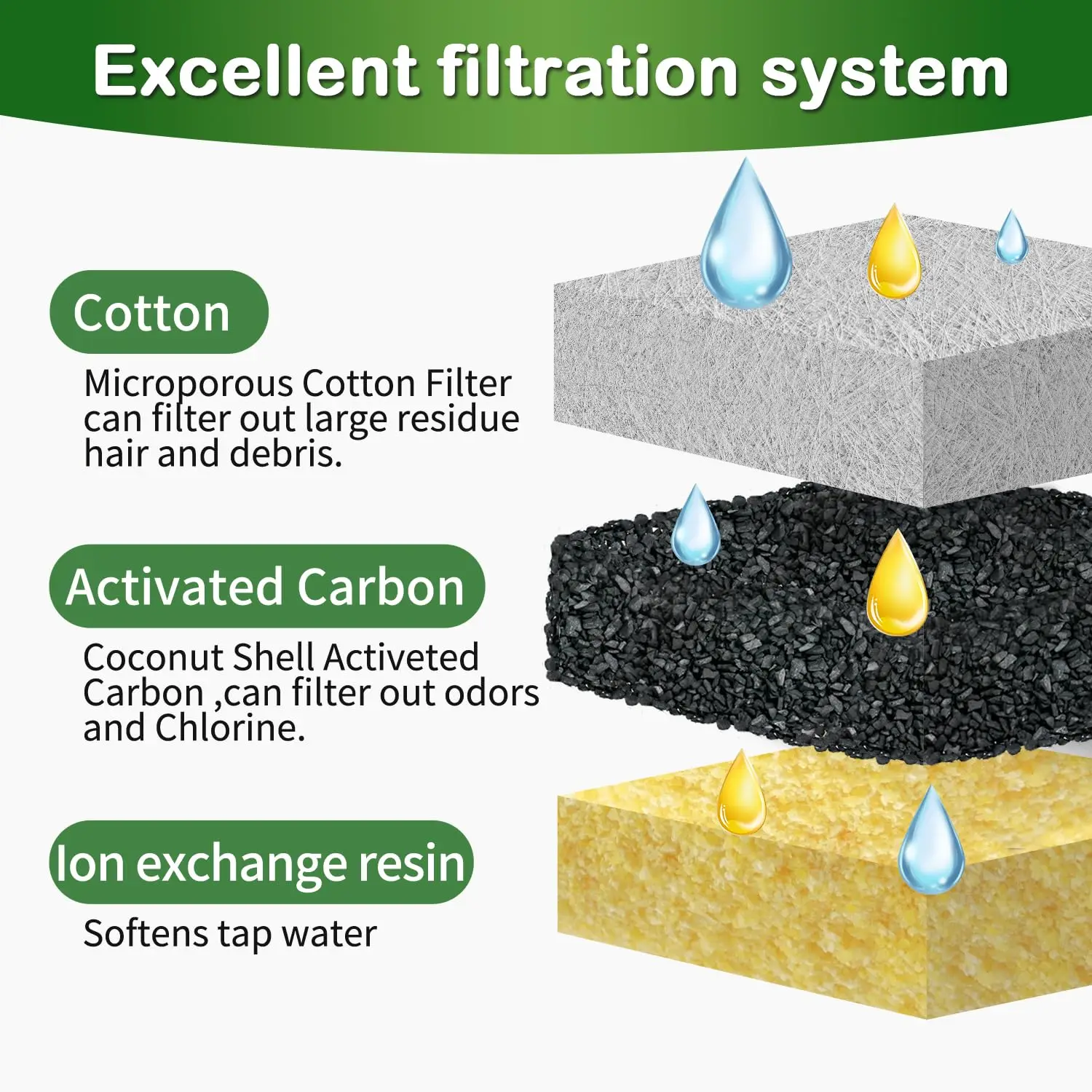 【Todo para la salud de tu mascota】 Los filtros de fuente para mascotas están compuestos de capas de algodón, carbón activado de cáscara de coco y resina de intercambio iónico.Cada gota de agua se filtra mediante filtración de tres capas para eliminar las impurezas y proporcionar agua enriquecida con oxígeno y con mejor sabor.Deje que sus adorables mascotas puedan beber agua limpia y fresca durante todo el día, lo que ayuda a aumentar el consumo de agua.