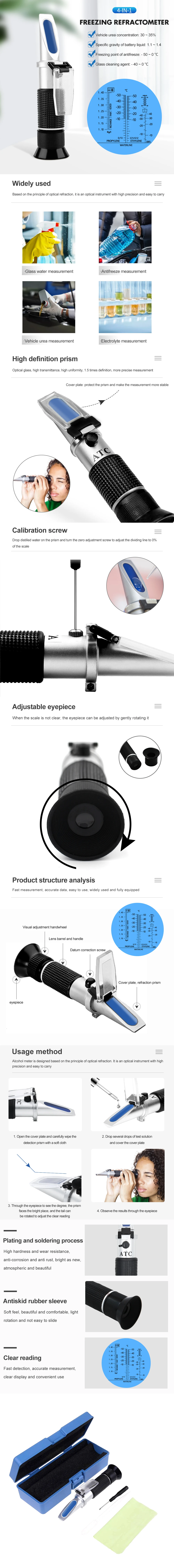 Este refractómetro óptico con seis escalas está diseñado para medir refrigerantes y anticongelantes a base de etilenglicol o propilenglicol, y mide la condición del fluido de la batería (escala cada división de la densidad del electrolito y corresponde a 0,01g/cm3). También mide el anticongelante (líquido limpiaparabrisas) a base de etanol y alcohol isopropílico. Y comprueba la concentración de urea en AdBlue.