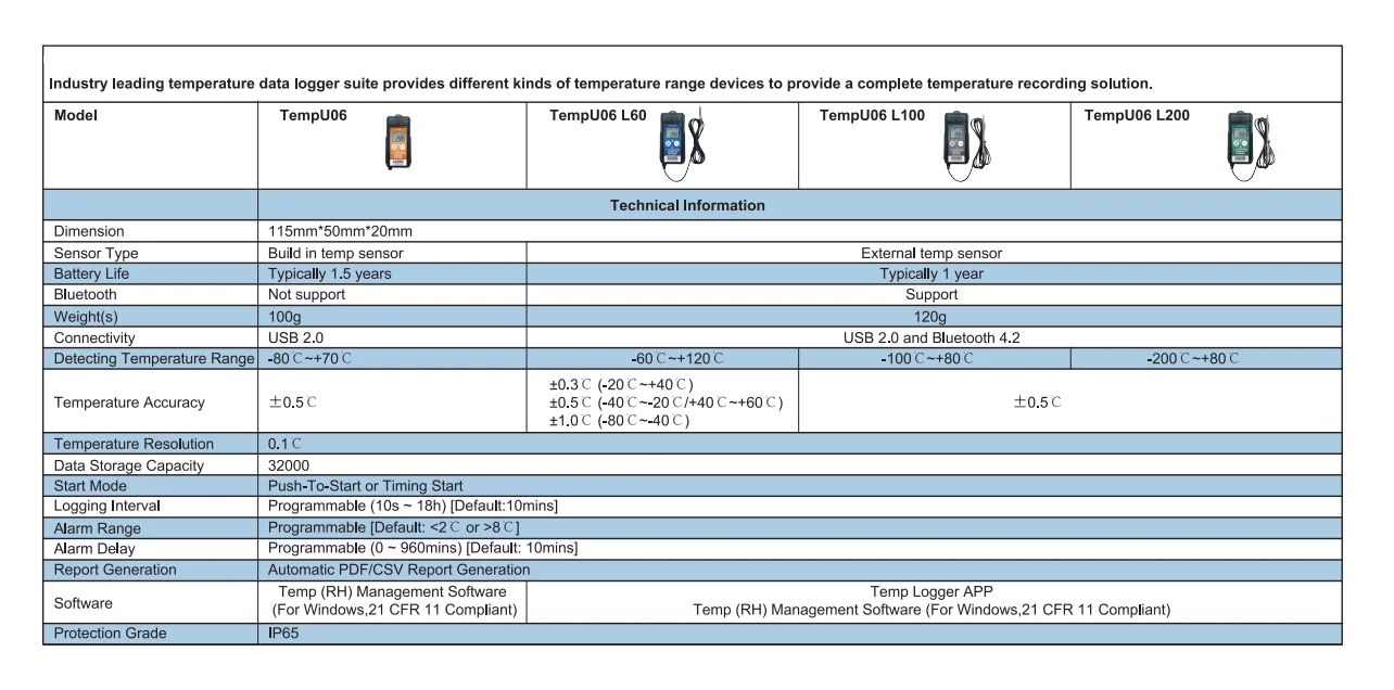 La serie TempU06 se utiliza principalmente para monitorear y registrar datos de temperatura de aspiradoras, productos farmacéuticos, alimentos y otros productos durante el almacenamiento y transporte.La conectividad Bluetooth de la serie TempU06 y la aplicación Temp Logger ofrece a los clientes las ventajas del seguimiento de datos para la visualización de datos.Y puede habilitar una conexión rápida con la PC para obtener datos mediante el software de gestión de temperatura, sin necesidad de cable ni lector para descargar datos.