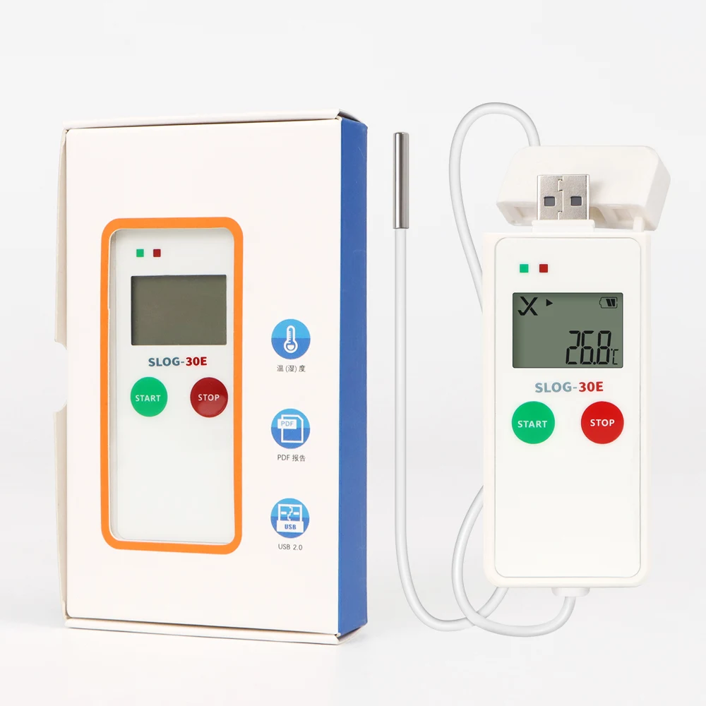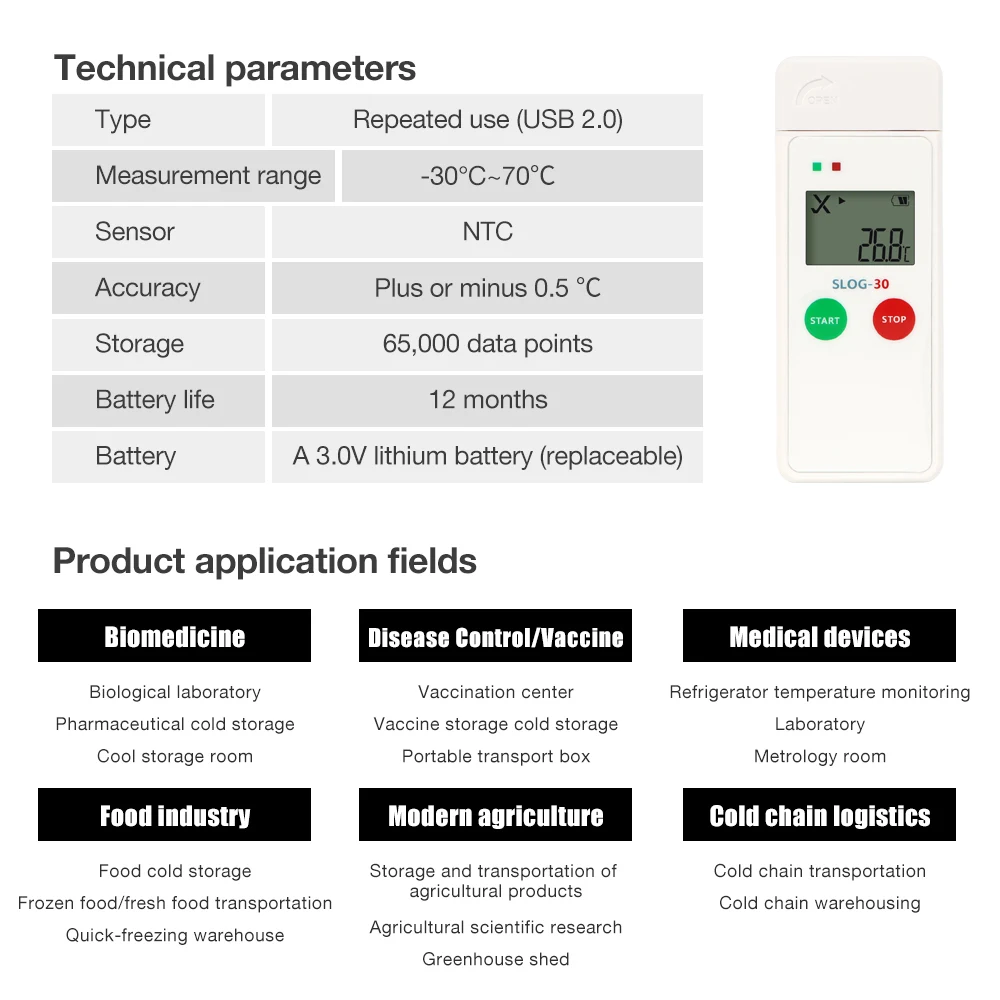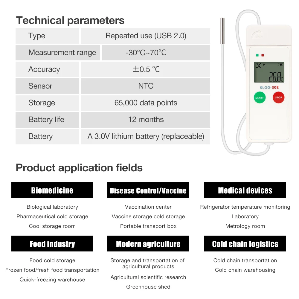 Registrador de datos de temperatura USB, conectado a una computadora, los datos se pueden cargar y exportar automáticamente a informes en formato PDF, con almacenamiento de 65000 datos, puede borrar todos los datos, uso repetido, intervalo de grabación ajustable, puede medir -30℃~70℃, adecuado para transporte refrigerado de alimentos, medicinas, productos farmacéuticos en cadena de frío, monitoreo de temperatura de vacunas, suministros químicos y otros productos en el almacenamiento y transporte de múltiples mediciones y registros de temperatura.