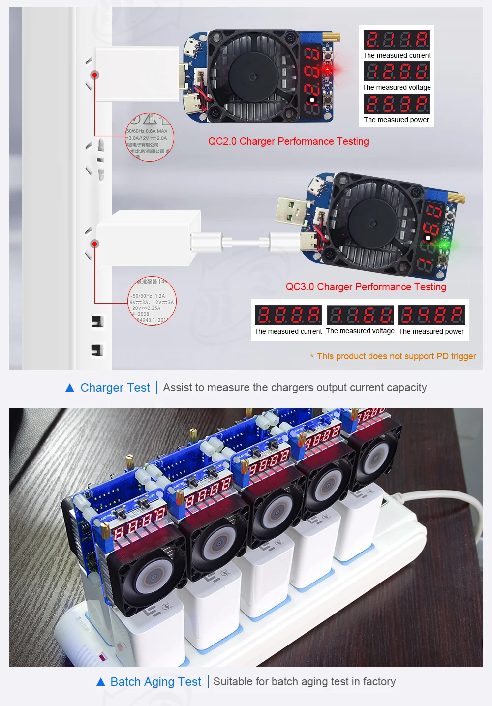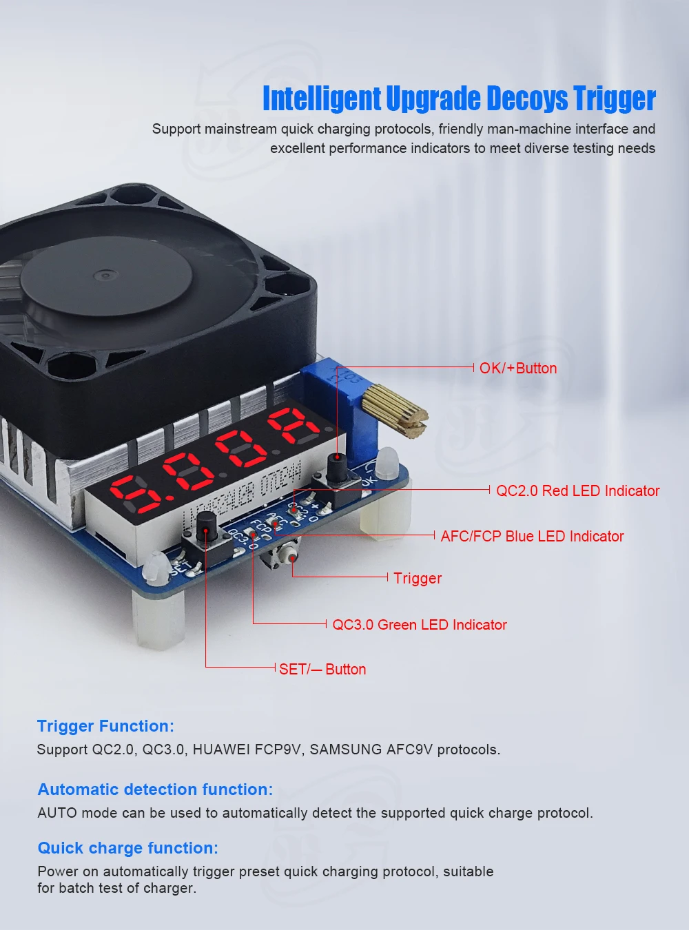 1, Triigger soporta QC2.0 (QC2.0 V 5, 9V, 12V y 20V), QC3.0, Huawei FCP, Samsung AFC 9V , no disparador PD