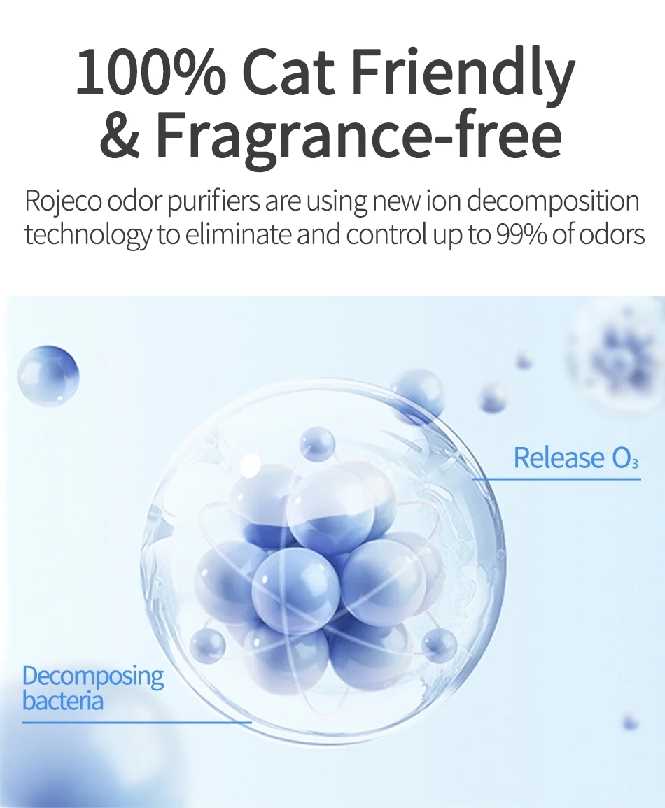 2: El desodorante de la caja de arena ROJECO tiene un generador de iones negativos en el interior. Libera iones negativos desodorantes y reductores de polvo y ayuda a reducir el polvo en la superficie de la arena para gatos en un 99.99%.