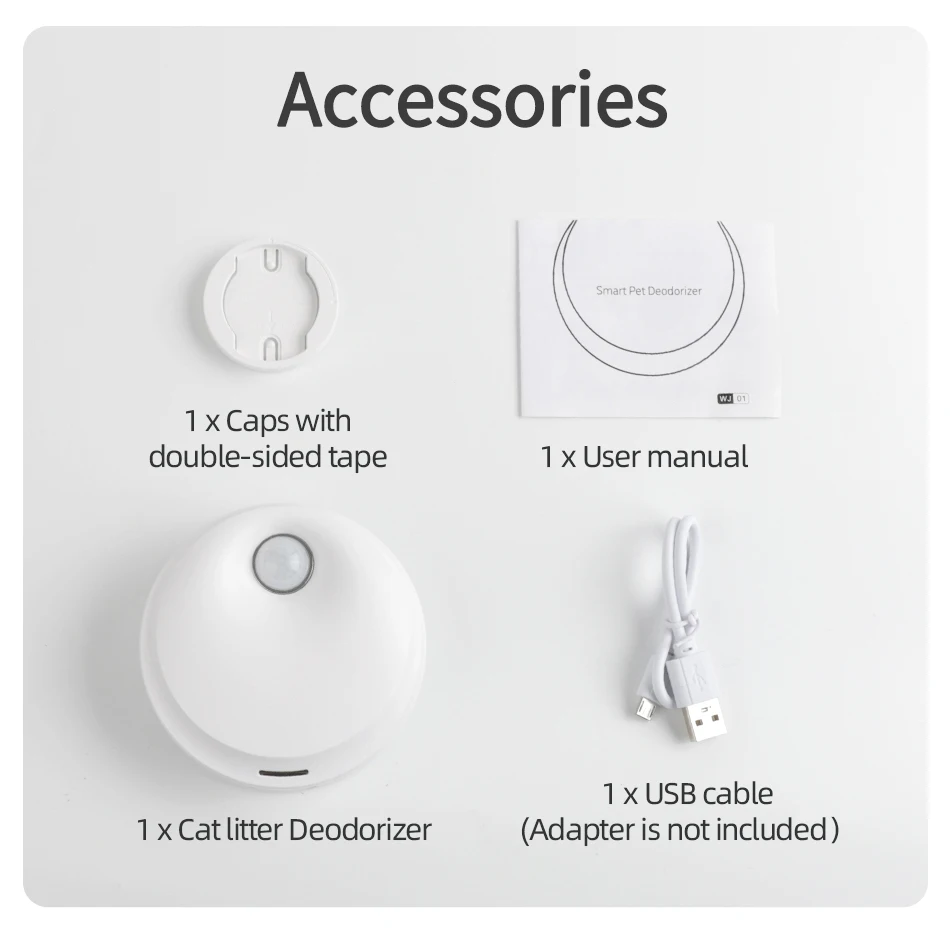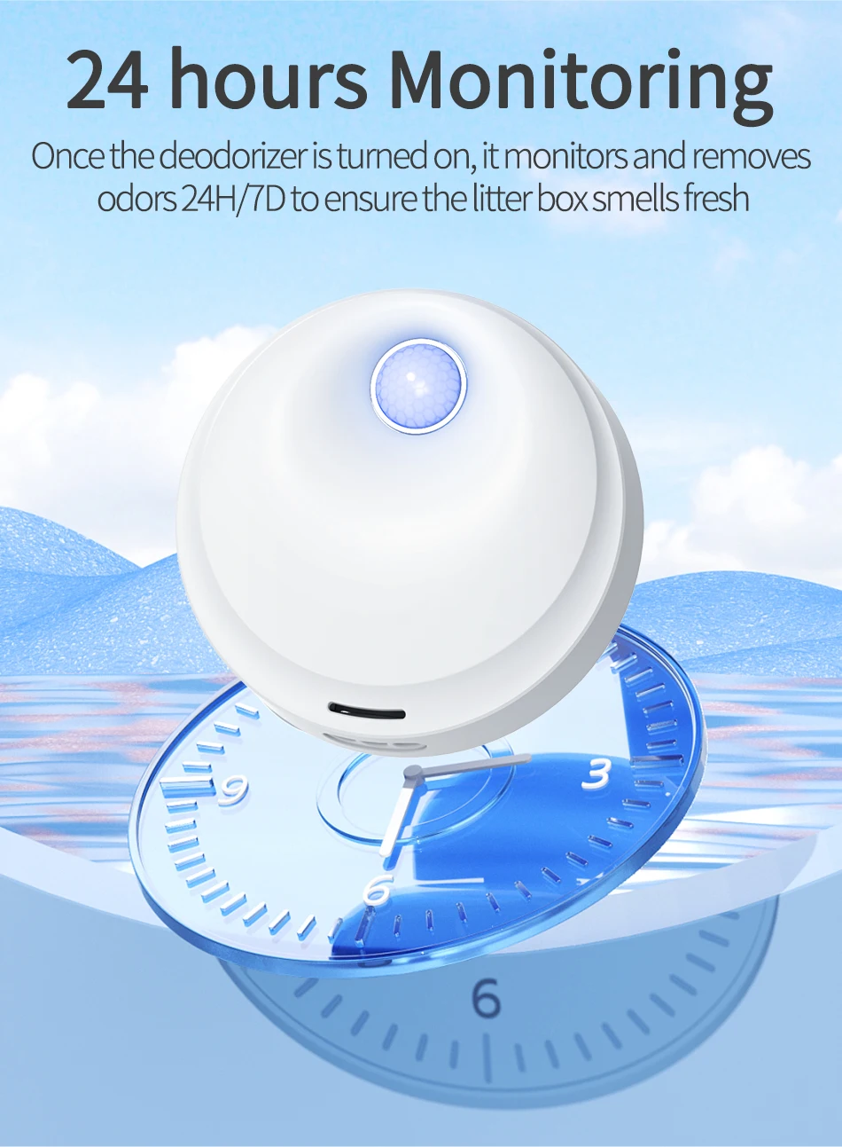 Equipado con un biosensor altamente sensible para capturar los movimientos de los gatos al entrar y salir de la caja de arena. Cuando el gato se acerque al eliminador de olores de la caja de arena, se apagará automáticamente y reiniciará La desodorización después de aproximadamente un año. No se molestará de ninguna manera.